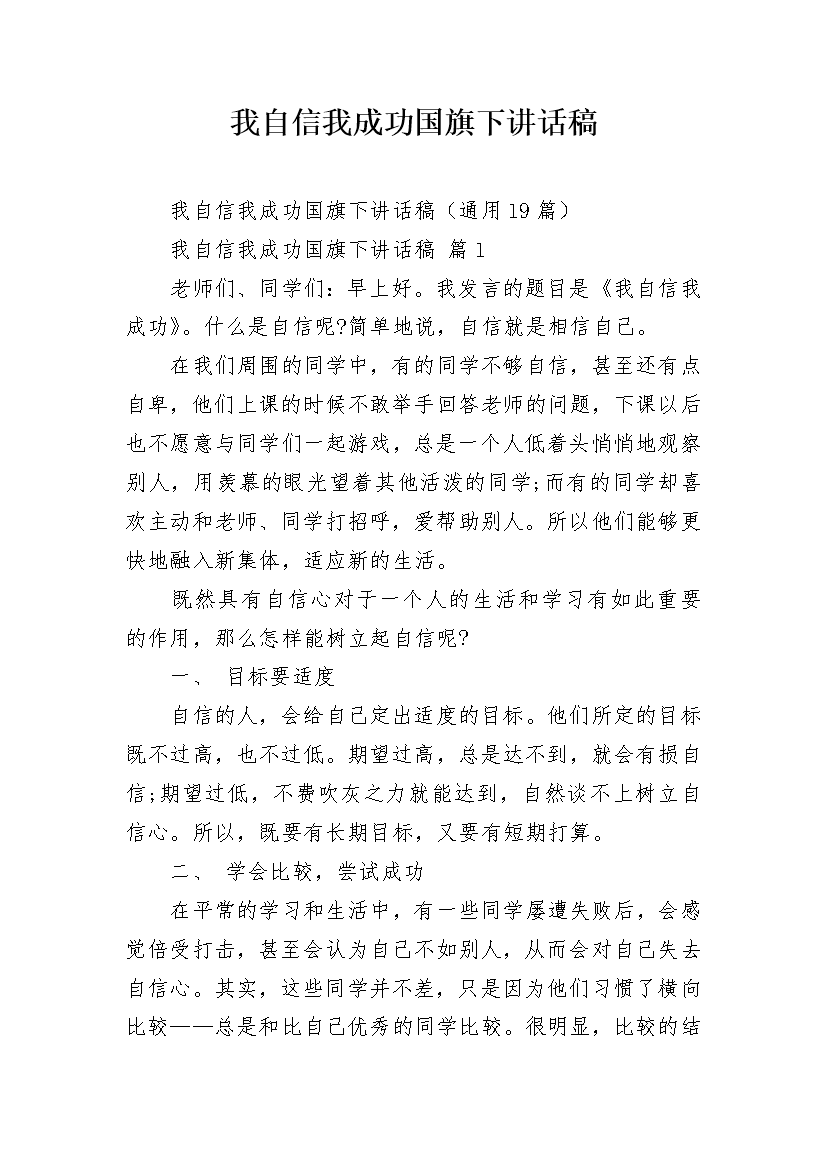我自信我成功国旗下讲话稿实用3篇尊敬的老师,亲爱的同学们:早上好!今天,我国旗下讲话的题目是——《我自信,我成功》。自信是什么?古往今来,多少名人为它做出了诠释。古代哲学家苏格拉底曾说过:“一个人能否有成就,只看他是否具有自尊心和自信心这两个条件。”诗圣杜甫告诉我们,自信是“会当凌绝顶,一览众山小”的气魄;诗仙李白告诉我们,自信是“天生我材必有用”的豪情,他告诉我们“自信人生二百年,会当击水三千里”的壮志。著名天文学家哥白尼,第一个对影响人类达千年之久的地心说提出怀疑和否认,虽然遭到千万人的反对及压迫,但