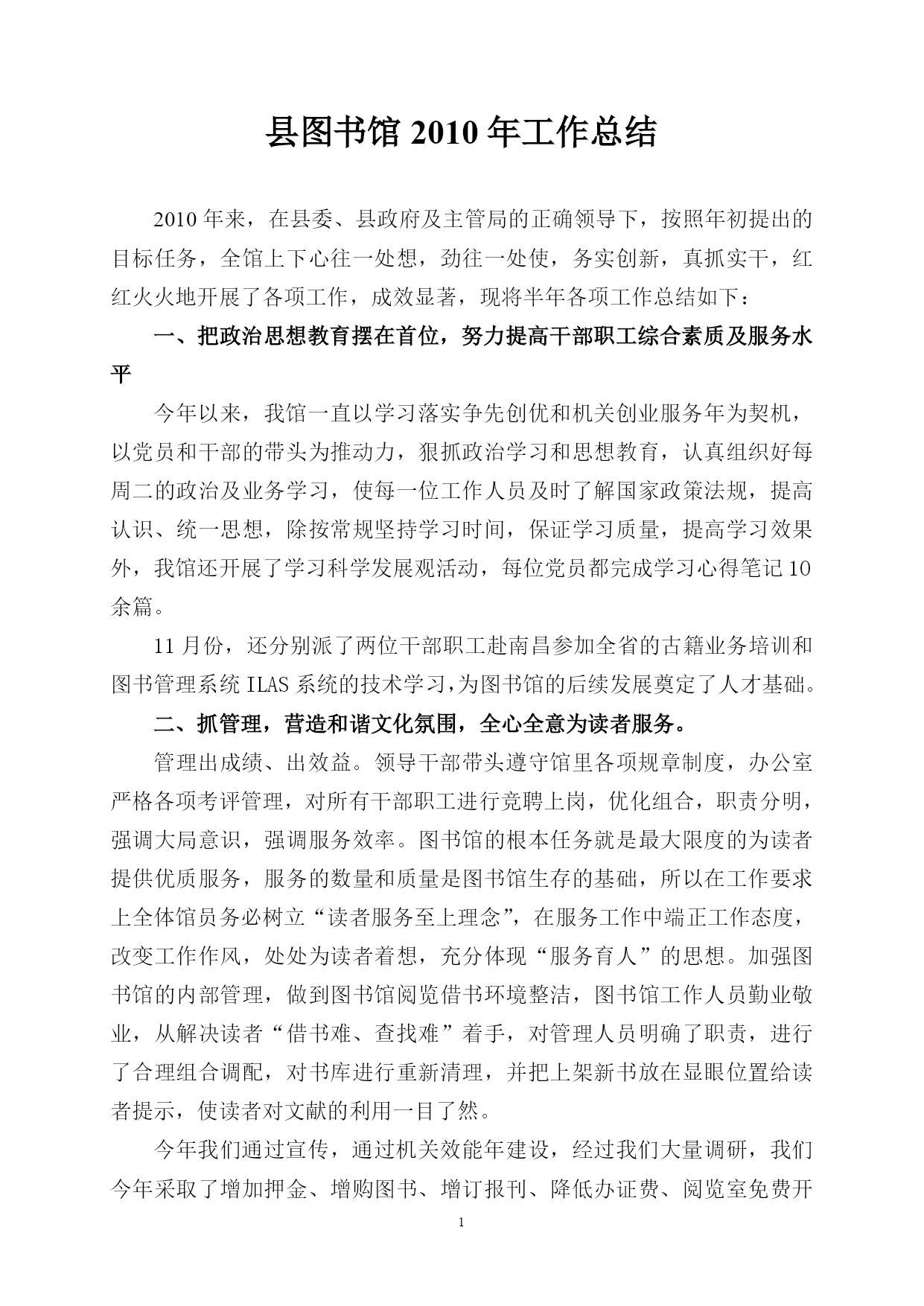 县图书馆2010年工作总结2010年来,在县委、县政府及主管局的正确领导下,按照年初提出的目标任务,全馆上下心往一处想,劲往一处使,务实创新,真抓实干,红红火火地开展了各项工作,成效显著,现将半年各项工作总结如下:一、把政治思想教育摆在首位,努力提高干部职工综合素质及服务水平今年以来,我馆一直以学习落实争先创优和机关创业服务年为契机,以党员和干部的带头为推动力,狠抓政治学习和思想教育,认真组织好每周二的政治及业务学习,使每一位工作人员及时了解国家政策法规,提高认识、统一思想,