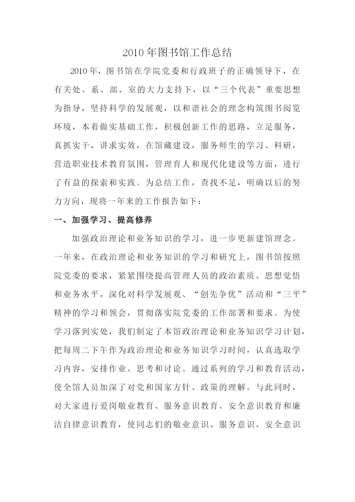 2010年图书馆工作总结2010年,图书馆在学院党委和行政班子的正确领导下,在有关处、系、部、室的大力支持下,以“三个代表”重要思想为指导,坚持科学的发展观,以和谐社会的理念构筑图书阅览环境,本着做实基础工作,积极创新工作的思路,立足服务,真抓实干,讲求实效,在馆藏建设,服务师生的学习、科研,营造职业技术教育氛围,管理育人和现代化建设等方面,进行了有益的探索和实践。为总结工作,查找不足,明确以后的努力方向,现将一年来的工作报告如下:一、加强学习、提高修养加强政治理论和业务知识的学习,进一步更新建馆理念。一