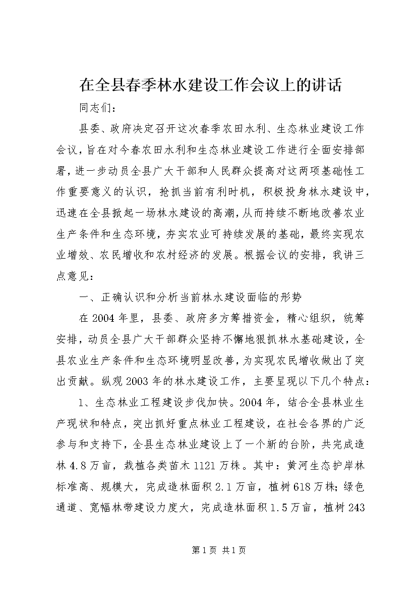 在全县春季林水建设工作会议上的讲话同志们:县委、政府决定召开这次春季农田水利、生态林业建设工作会议,旨在对今春农田水利和生态林业建设工作进行全面安排部署,进一步动员全县广大干部和人民群众提高对这两项基础性工作重要意义的认识,抢抓当前有利时机,积极投身林水建设中,迅速在全县掀起一场林水建设的高潮,从而持续不断地改善农业生产条件和生态环境,夯实农业可持续发展的基础,最终实现农业增效、农民增收和农村经济的发展。根据会议的安排,我讲三点意见:一、正确认识和分析当前林水建设面临的形势在20