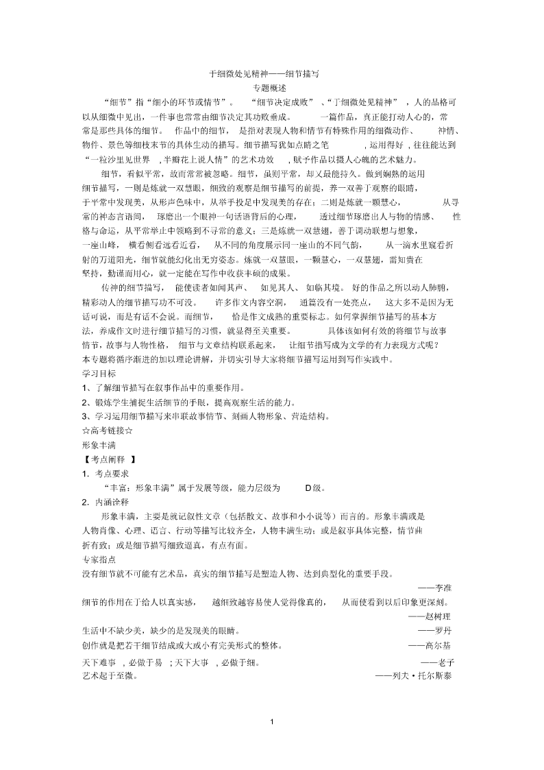 优秀资料欢迎下载于细微处见精神——细节描写专题概述“细节”指“细小的环节或情节”。“细节决定成败”、“于细微处见精神”,人的品格可以从细微中见出,一件事也常常由细节决定其功败垂成。一篇作品,真正能打动人心的,常常是那些具体的细节。作品中的细节,是指对表现人物和情节有特殊作用的细微动作、神情、物件、景色等细枝末节的具体生动的描写。细节描写犹如点睛之笔,运用得好,往往能达到“一粒沙里见世界,半瓣花上说人情”的艺术功效,赋予作品以摄人心魄的艺术魅力。细节,看似平常,故而常常被忽略。细节,虽则平常,却又最能持久。