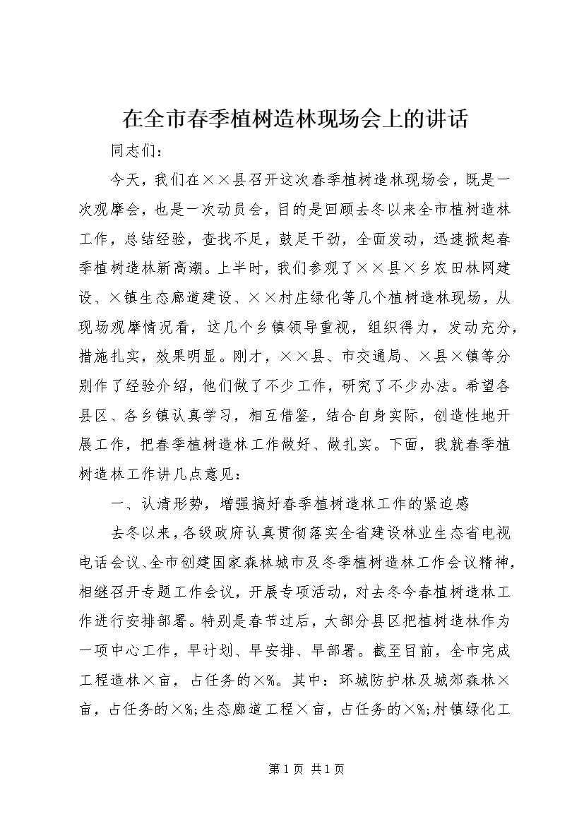 在全市春季植树造林现场会上的讲话同志们:今天,我们在××县召开这次春季植树造林现场会,既是一次观摩会,也是一次动员会,目的是回顾去冬以来全市植树造林工作,总结经验,查找不足,鼓足干劲,全面发动,迅速掀起春季植树造林新高潮。上半时,我们参观了××县×乡农田林网建设、×镇生态廊道建设、××村庄绿化等几个植树造林现场,从现场观摩情况看,这几个乡镇领导重视,组织得力,发动充分,措施扎实,效果明显。刚才,××县、市交通局、×县×镇等分别作了经验介绍,他们做了不少工作,研究了不少办法。希望各