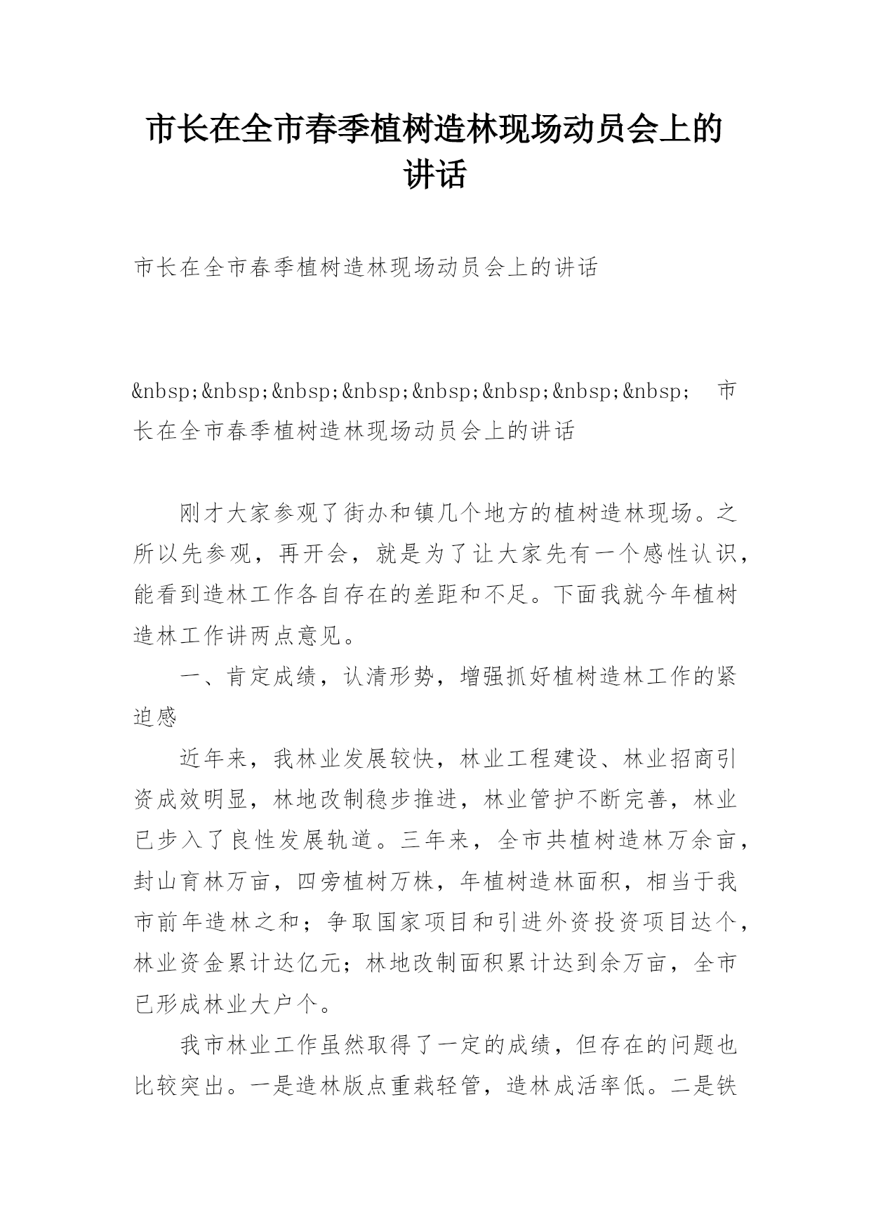 市长在全市春季植树造林现场动员会上的讲话市长在全市春季植树造林现场动员会上的讲话 市长在全市春季植树造林现场动员会上的讲话刚才大家参观了街办和镇几个地方的植树造林现场。之所以先参观,再开会,就是为了让大家先有一个感性认识,能看到造林工作各自存在的差距和不足。下面我就今年植树造林工作讲两点意见。一、肯定成绩,认清形势,增强抓好植树造林工作的紧迫感近年来,我林业发展较快,林业工程建设、林业招商引资成效明显,林地改制稳