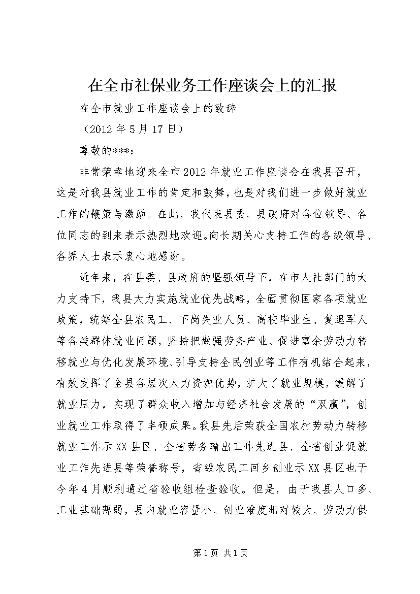 在全市社保业务工作座谈会上的汇报在全市就业工作座谈会上的致辞(2012年5月17日)尊敬的***:非常荣幸地迎来全市2012年就业工作座谈会在我县召开,这是对我县就业工作的肯定和鼓舞,也是对我们进一步做好就业工作的鞭策与激励。在此,我代表县委、县政府对各位领导、各位同志的到来表示热烈地欢迎。向长期关心支持工作的各级领导、各界人士表示衷心地感谢。近年来,在县委、县政府的坚强领导下,在市人社部门的大力支持下,我县大力实施就业优先战略,全面贯彻国家各项就业政策,统筹全县农民工、下岗失业