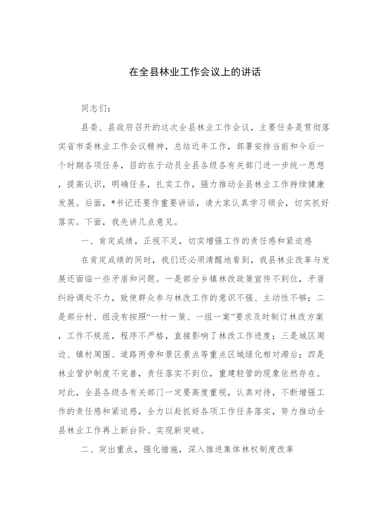 在全县林业工作会议上的讲话同志们:县委、县政府召开的这次全县林业工作会议,主要任务是贯彻落实省市委林业工作会议精神,总结近年工作,部署安排当前和今后一个时期各项任务,目的在于动员全县各级各有关部门进一步统一思想,提高认识,明确任务,扎实工作,强力推动全县林业工作持续健康发展。后面,*书记还要作重要讲话,请大家认真学习领会,切实抓好落实。下面,我先讲几点意见。一、肯定成绩,正视不足,切实增强工作的责任感和紧迫感在肯定成绩的同时,我们还必须清醒地看到,我县林业改革与发展还面临一些矛盾和问题。一是部分乡镇林改政
