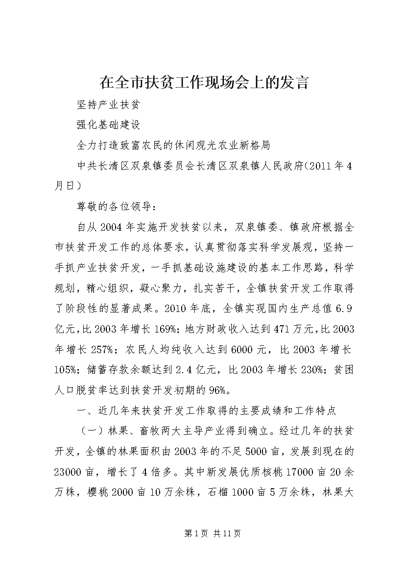 在全市扶贫工作现场会上的发言坚持产业扶贫强化基础建设全力打造致富农民的休闲观光农业新格局中共长清区双泉镇委员会长清区双泉镇人民政府(2011年4月日)尊敬的各位领导:自从2004年实施开发扶贫以来,双泉镇委、镇政府根据全市扶贫开发工作的总体要求,认真贯彻落实科学发展观,坚持一手抓产业扶贫开发,一手抓基础设施建设的基本工作思路,科学规划,精心组织,凝心聚力,扎实苦干,全镇扶贫开发工作取得了阶段性的显著成果。2010年底,全镇实现国内生产总值6.9亿元,比2003年增长169%;地方财政收入达到471万元,比