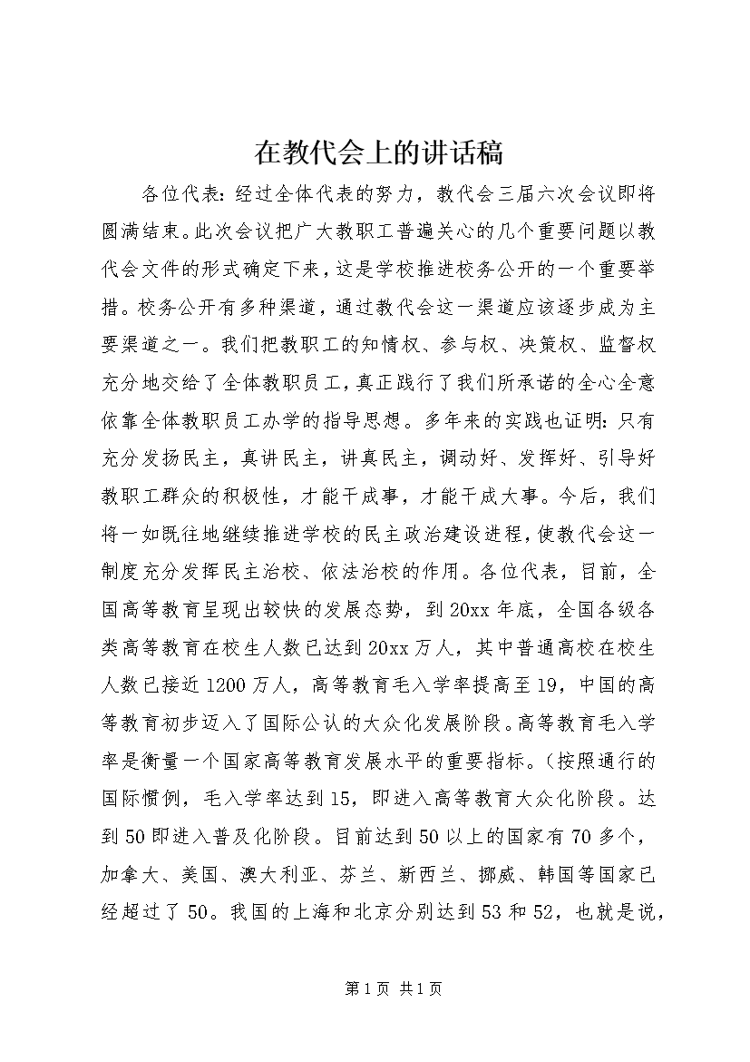 在教代会上的讲话稿各位代表:经过全体代表的努力,教代会三届六次会议即将圆满结束。此次会议把广大教职工普遍关心的几个重要问题以教代会文件的形式确定下来,这是学校推进校务公开的一个重要举措。校务公开有多种渠道,通过教代会这一渠道应该逐步成为主要渠道之一。我们把教职工的知情权、参与权、决策权、监督权充分地交给了全体教职员工,真正践行了我们所承诺的全心全意依靠全体教职员工办学的指导思想。多年来的实践也证明:只有充分发扬民主,真讲民主,讲真民主,调动好、发挥好、引导好教职工群众的积极性,才能干成事,才能