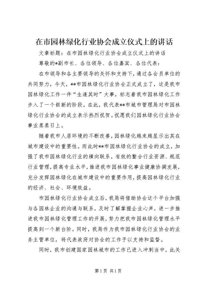 /NUMPAGES4在市园林绿化行业协会成立仪式上的讲话稿在市园林绿化行业协会成立仪式上的讲话稿1尊敬的xxx副市长、各位领导、各位嘉宾、各位代表:在市领导和各主要领导的关怀和支持下,通过各会员单位的共同努力,今天,xx市园林绿化行业协会正式成立了,这是我市园林绿化工作一件“生逢其时”大事,标志着我市园林绿化工作步入了一个崭新的阶段。在此,我代表xx市城市管理局对市园林绿化行业协会的成立表示热烈祝贺!祝愿我们园林绿化行业协会事业蒸蒸日上!随着我市人居环境的不断改善,园林绿化越来越显示