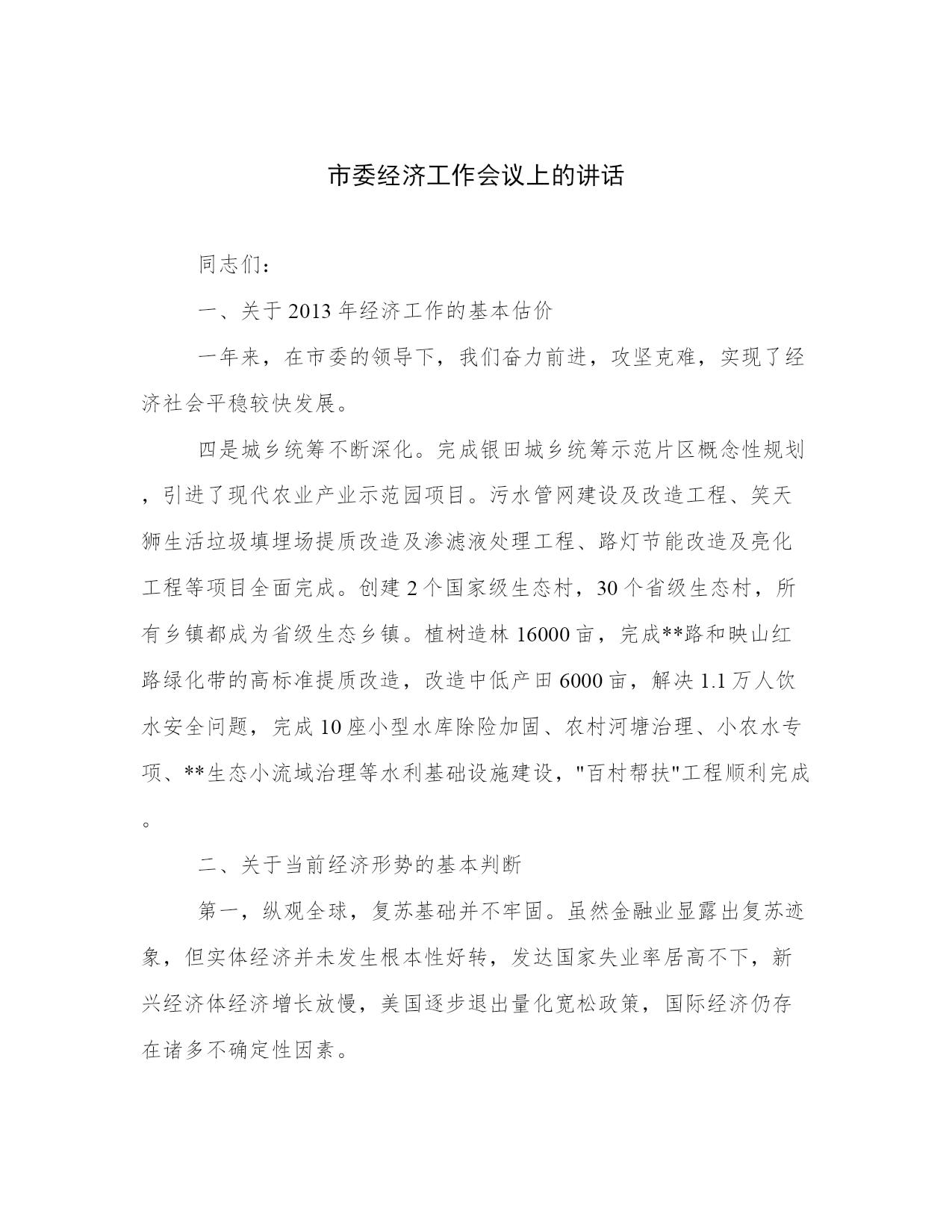 市委经济工作会议上的讲话市委经济工作会议上的讲话同志们:这次市委经济工作会议,是在岁末年初关键时期召开的一次重要会议。主要任务是学习贯彻十八届三中全会、中央经济工作和城镇化工作会议精神,总结2013年工作,分析当前形势,部署2014年工作。等下,书记将作重要讲话,请大家认真领会,抓好落实。下面,我先讲三点意见:一、关于2013年经济工作的基本估价一年来,在市委的领导下,我们奋力前进,攻坚克难,实现了经济社会平稳较快发展。一是综合实力明显增强。全年地区生产总值达到57亿元(预计,下同),增长15%;完成固定
