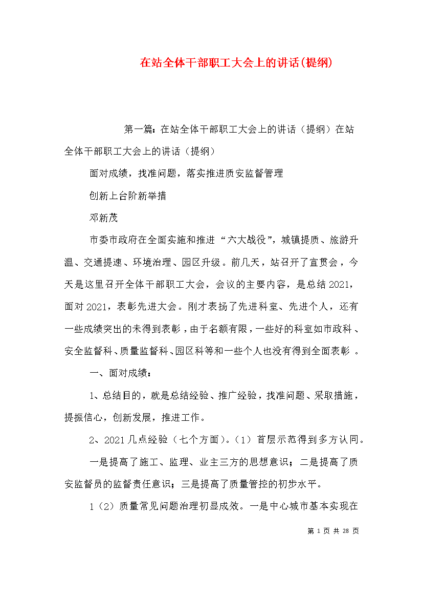 第PAGE\*Arabic\*MERGEFORMAT29页共NUMPAGES\*MERGEFORMAT29页在站全体干部职工大会上的讲话(提纲)第一篇:在站全体干部职工大会上的讲话(提纲)在站全体干部职工大会上的讲话(提纲)面对成绩,找准问题,落实推进质安监督管理创新上台阶新举措邓新茂市委市政府在全面实施和推进“六大战役”,城镇提质、旅游升温、交通提速、环境治理、园区升级。前几天,站召开了宣贯会,今天是这里召开全体干部职工大会,会议的主要内容,是总结2016,面对2017,表彰先进大会。刚才表