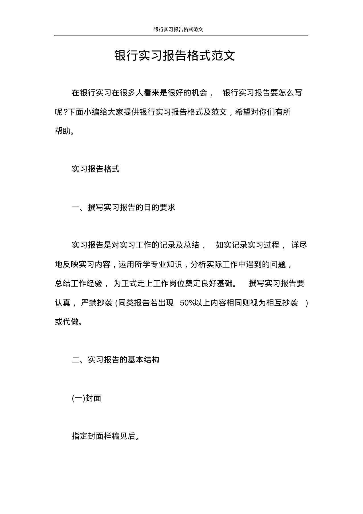 银行实习报告格式范文银行实习报告格式范文在银行实习在很多人看来是很好的机会,银行实习报告要怎么写呢?下面小编给大家提供银行实习报告格式及范文,希望对你们有所帮助。实习报告格式一、撰写实习报告的目的要求实习报告是对实习工作的记录及总结,如实记录实习过程,详尽地反映实习内容,运用所学专业知识,分析实际工作中遇到的问题,总结工作经验,为正式走上工作岗位奠定良好基础。撰写实习报告要认真,严禁抄袭(同类报告若出现50%以上内容相同则视为相互抄袭)或代做。二、实习报告的基本结构(一)封面指定封面样稿见后。银行实习报告