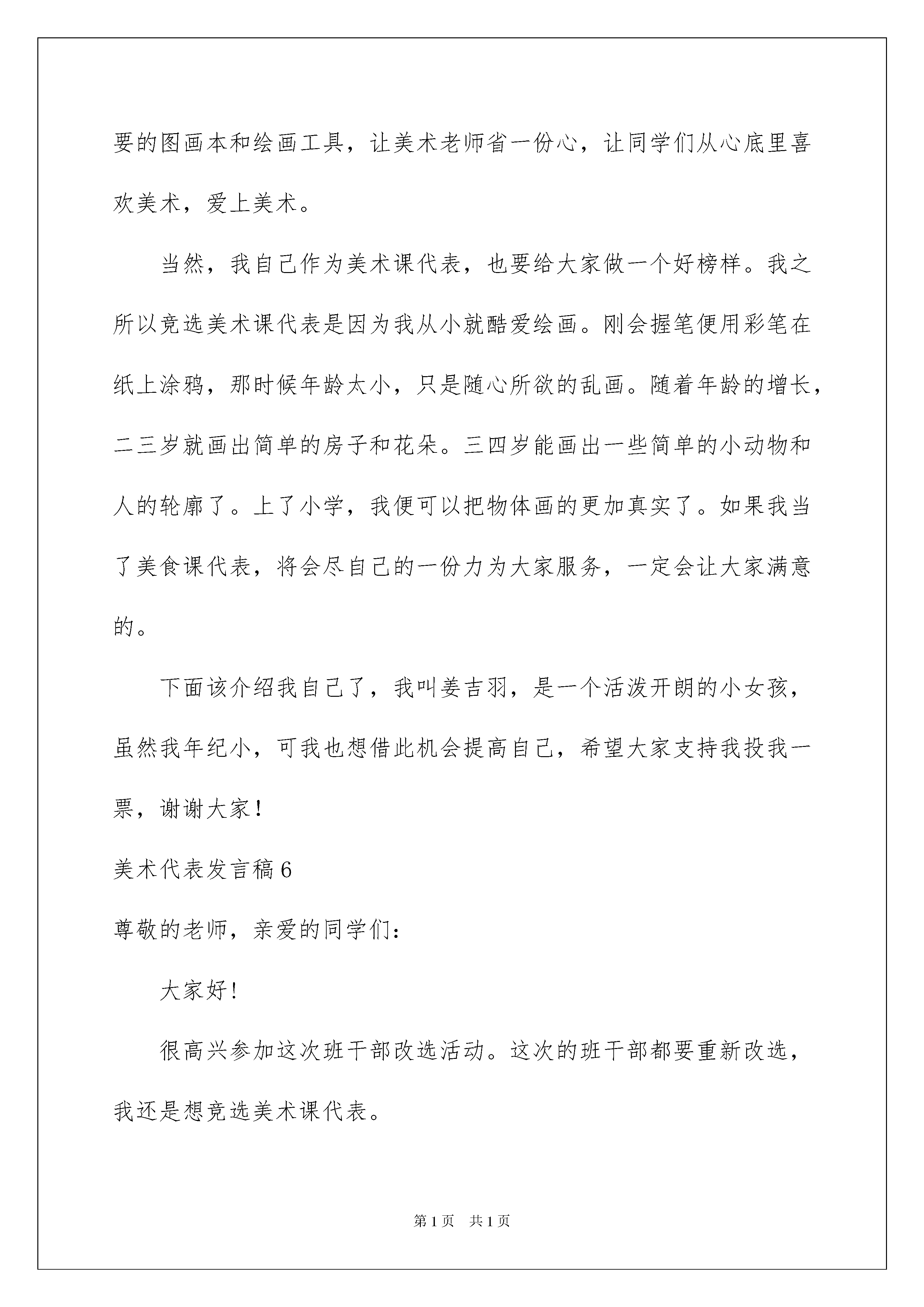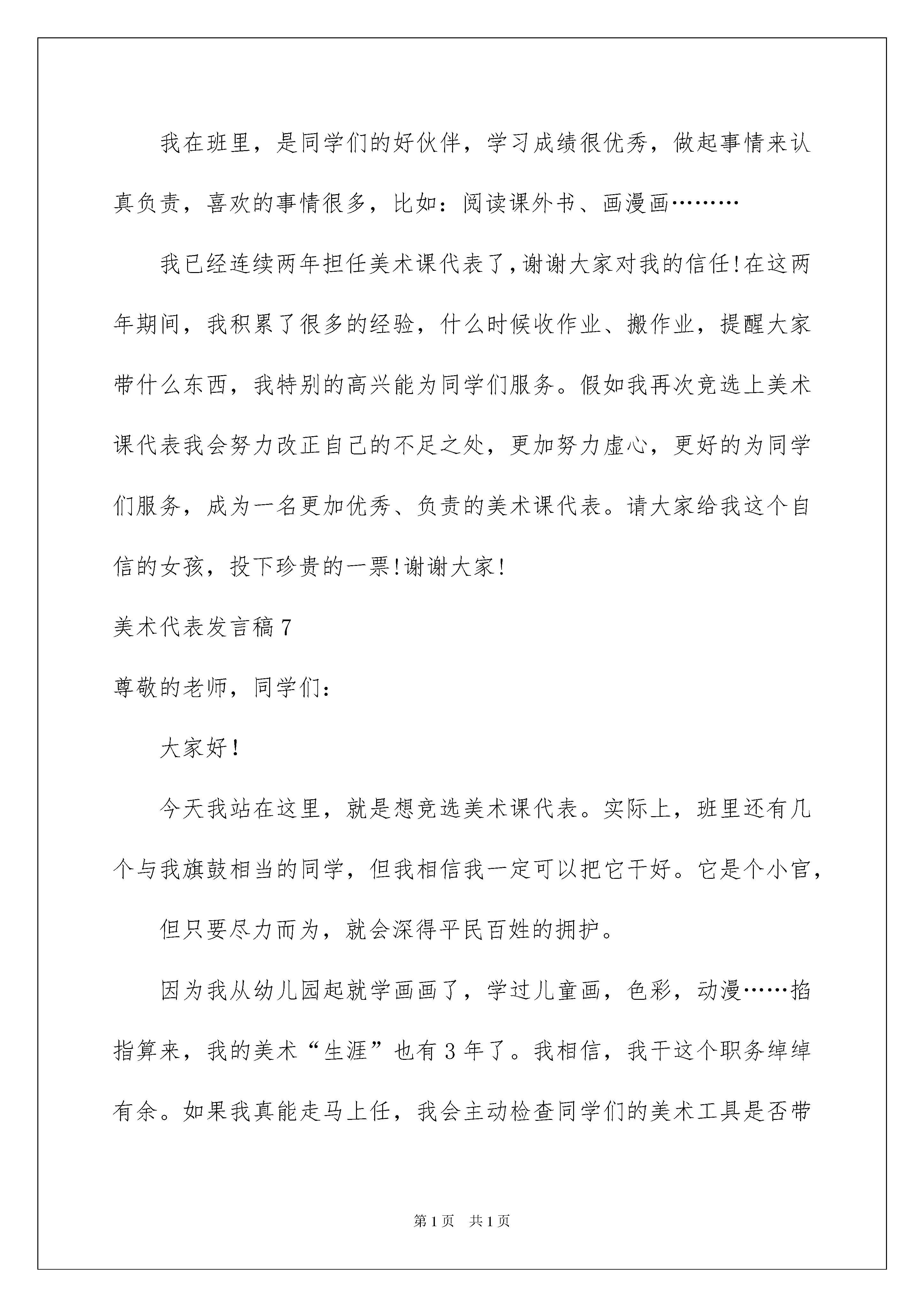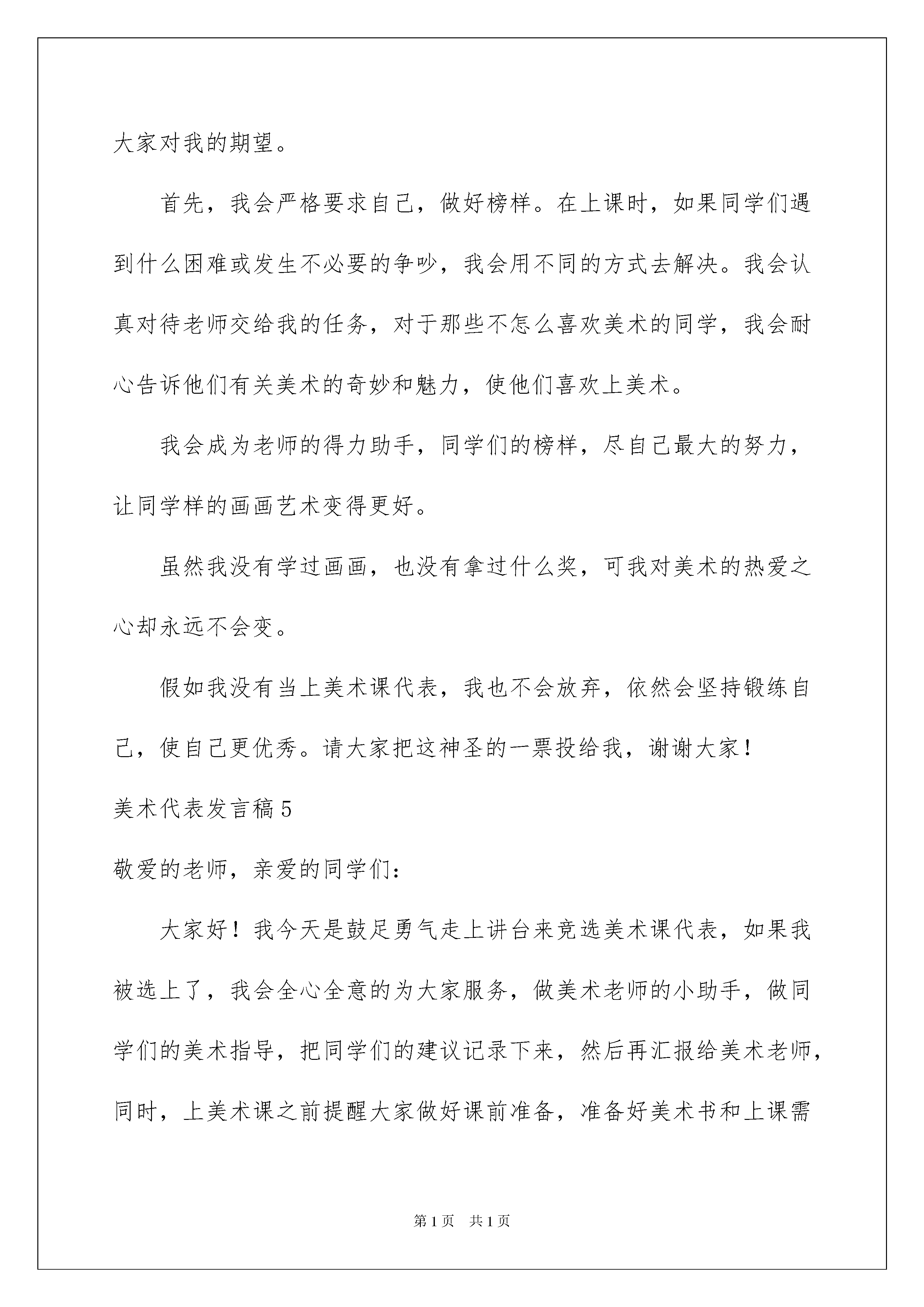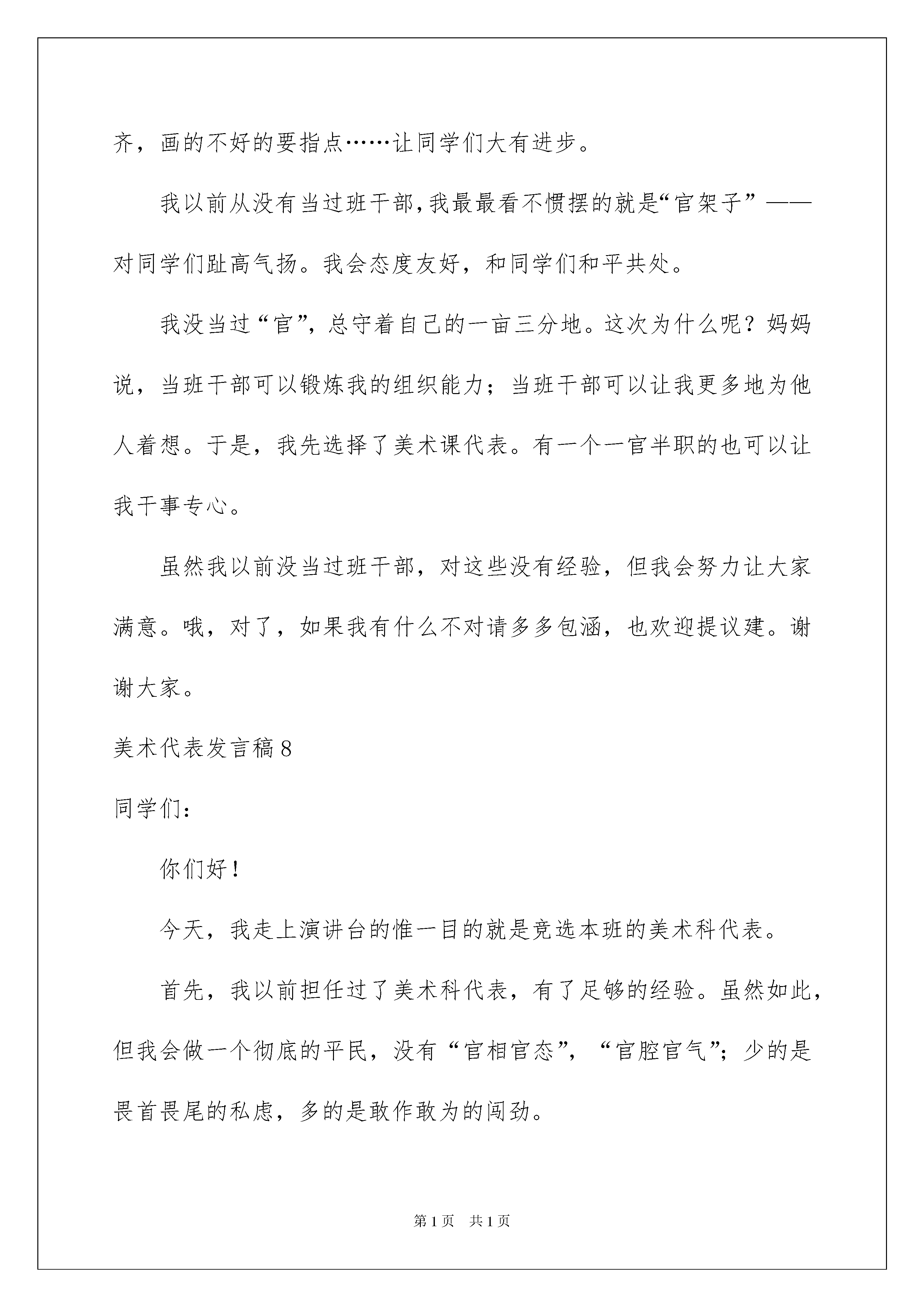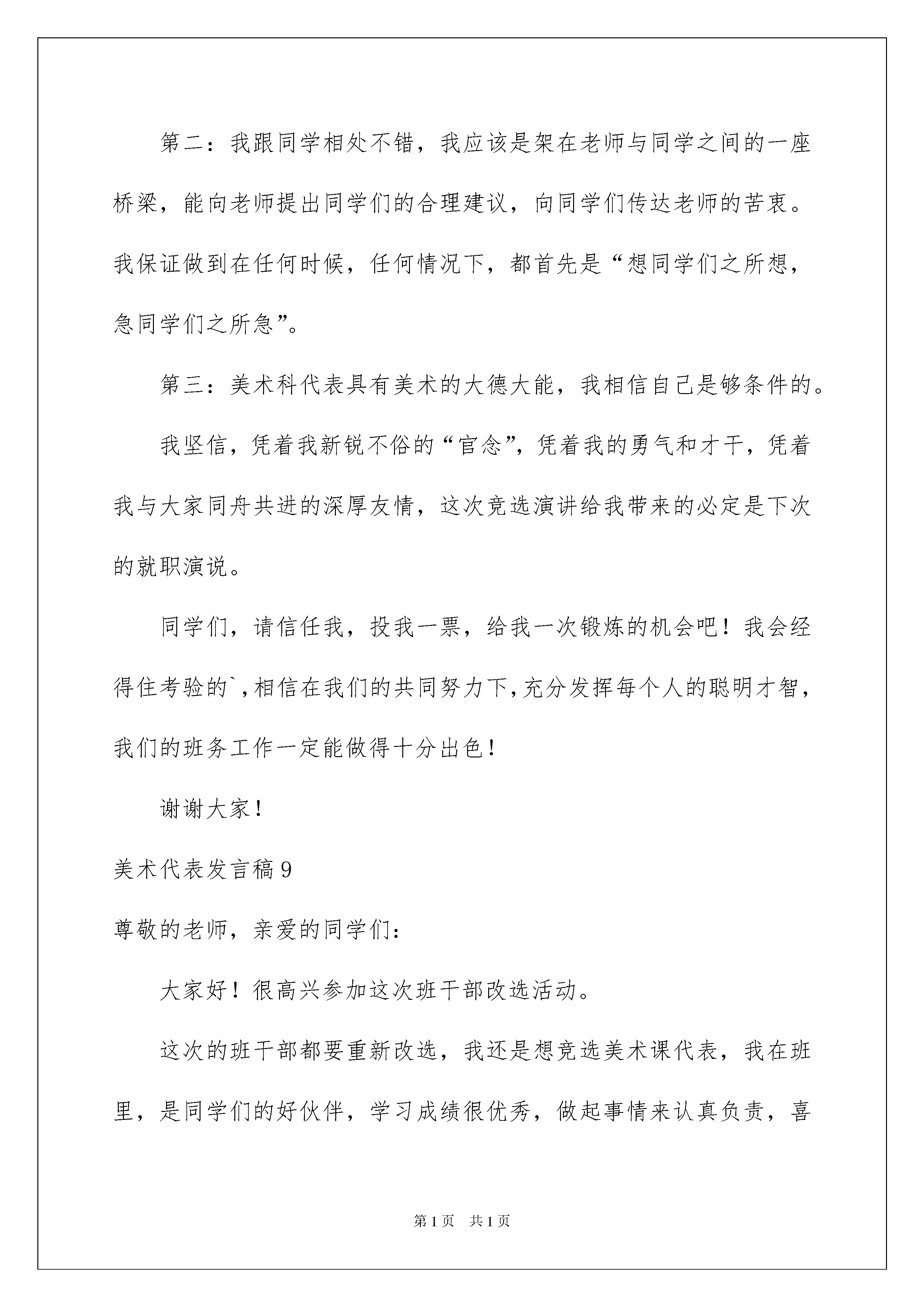 2022美术代表发言稿美术代表发言稿在充满活力,日益开放的今天,需要使用发言稿的场合越来越多,发言稿要求内容充实,条理清楚,重点突出。怎样写发言稿才能更好地发挥其做用呢?以下是我帮大家整理的美术代表发言稿,希望对大家有所帮助。美术代表发言稿1尊敬的老师、亲爱的同学们:你们好!我想竞选美术课代表,因为我有实力,也有信心。我8岁那年就模仿哥哥画的作品画了