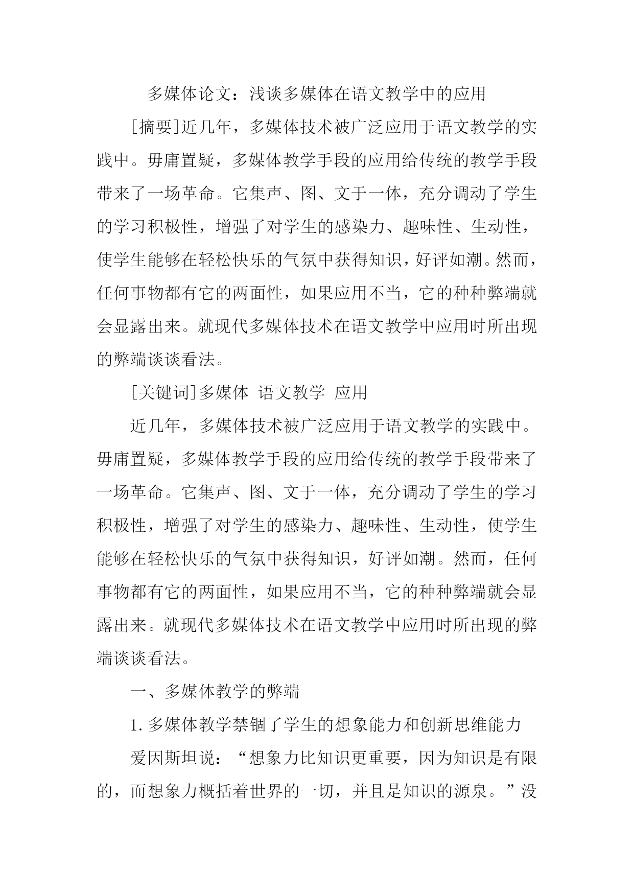 多媒体论文:浅谈多媒体在语文教学中的应用[摘要]近几年,多媒体技术被广泛应用于语文教学的实践中。毋庸置疑,多媒体教学手段的应用给传统的教学手段带来了一场革命。它集声、图、文于一体,充分调动了学生的学习积极性,增强了对学生的感染力、趣味性、生动性,使学生能够在轻松快乐的气氛中获得知识,好评如潮。然而,任何事物都有它的两面性,如果应用不当,它的种种弊端就会显露出来。就现代多媒体技术在语文教学中应用时所出现的弊端谈谈看法。[关键词]多媒体语文教学应用近几年,多媒体技术被广泛应用于语文教学的实践中。毋庸置疑,多媒