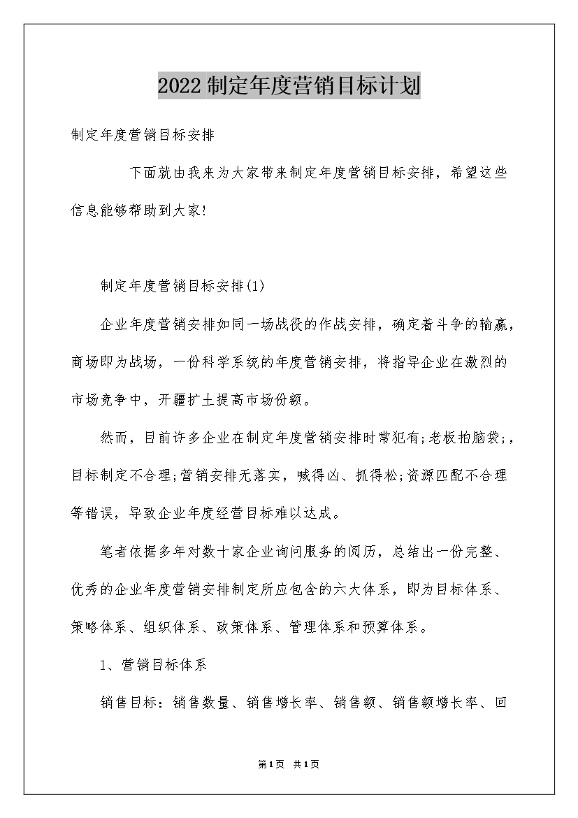 2022制定年度营销目标计划制定年度营销目标安排下面就由我来为大家带来制定年度营销目标安排,希望这些信息能够帮助到大家!制定年度营销目标安排(1)企业年度营销安排如同一场战役的作战安排,确定着斗争的输赢,商场即为战场,一份科学系统的年度营销安排,将指导企业在激烈的市场竞争中,开疆扩土提高市场份额。然而,目前许多企业在制定年度营销安排时常犯有;老板拍脑袋;,目标制定不合理;营销