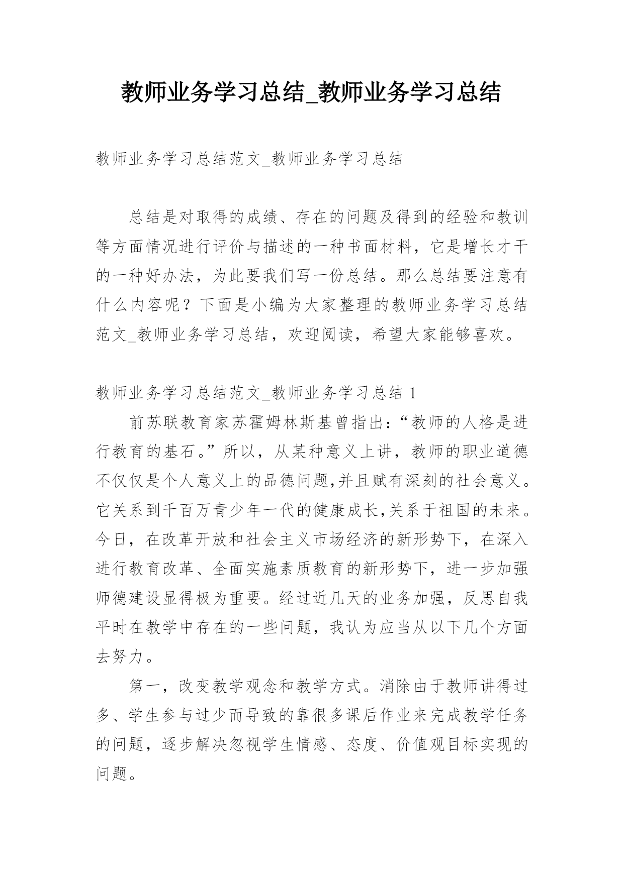 教师业务学习总结_教师业务学习总结教师业务学习总结范文_教师业务学习总结1前苏联教育家苏霍姆林斯基曾指出:“教师的人格是进行教育的基石。”所以,从某种意义上讲,教师的职业道德不仅仅是个人意义上的品德问题,并且赋有深刻的社会意义。它关系到千百万青少年一代的健康成长,关系于祖国的未来。今日,在改革开放和社会主义市场经济的新形势下,在深入进行教育改革、全面实施素质教育的新形势下,进一步加强师德建设显得极为重要。经过近几天的业务加强,反思自我平时在教学中存在的一些问题,我认为应当从以下几个方面去努力。第一,改变教