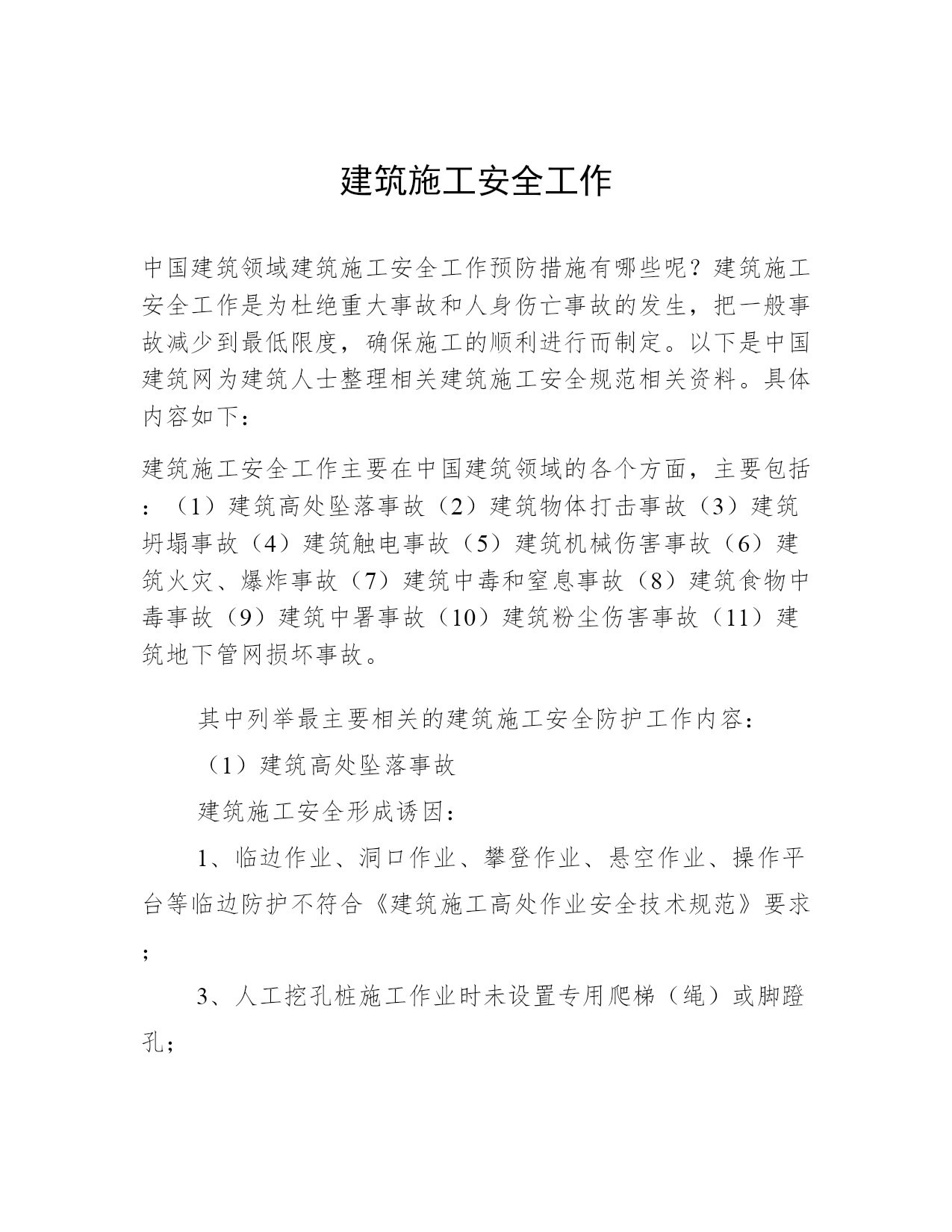 建筑施工安全工作HYPERLINK"http://www.cbi360.net/"\h中国建筑领域建筑施工安全工作预防措施有哪些呢?建筑施工安全工作是为杜绝重大事故和人身伤亡事故的发生,把一般事故减少到最低限度,确保施工的顺利进行而制定。以下是中国建筑网为建筑人士整理相关建筑施工安全规范相关资料。具体内容如下:HYPERLINK"http://www.cbi360.net/"\h建筑施工安全工作主要在中国建筑领域的各个方面,主要包括:(1)建筑高处坠落事故(2)建筑物体打击事故(3)建筑坍塌事故