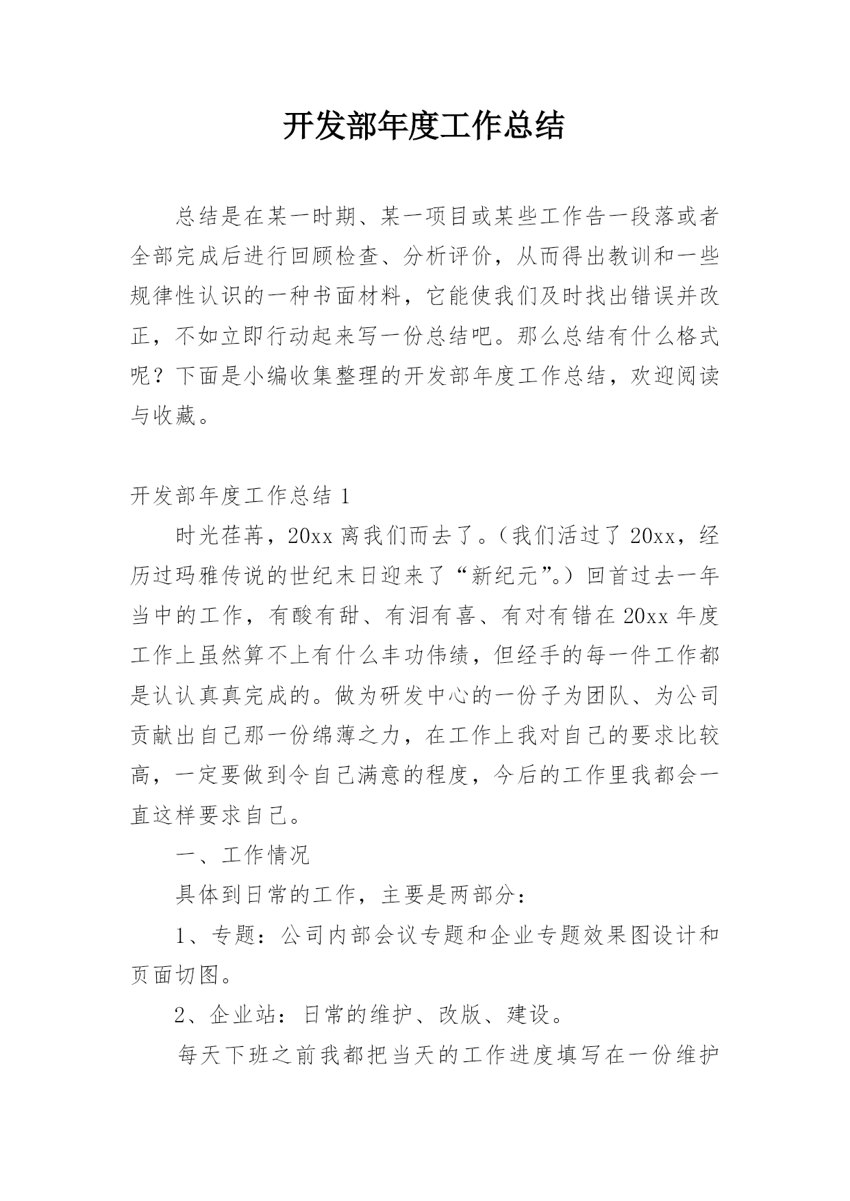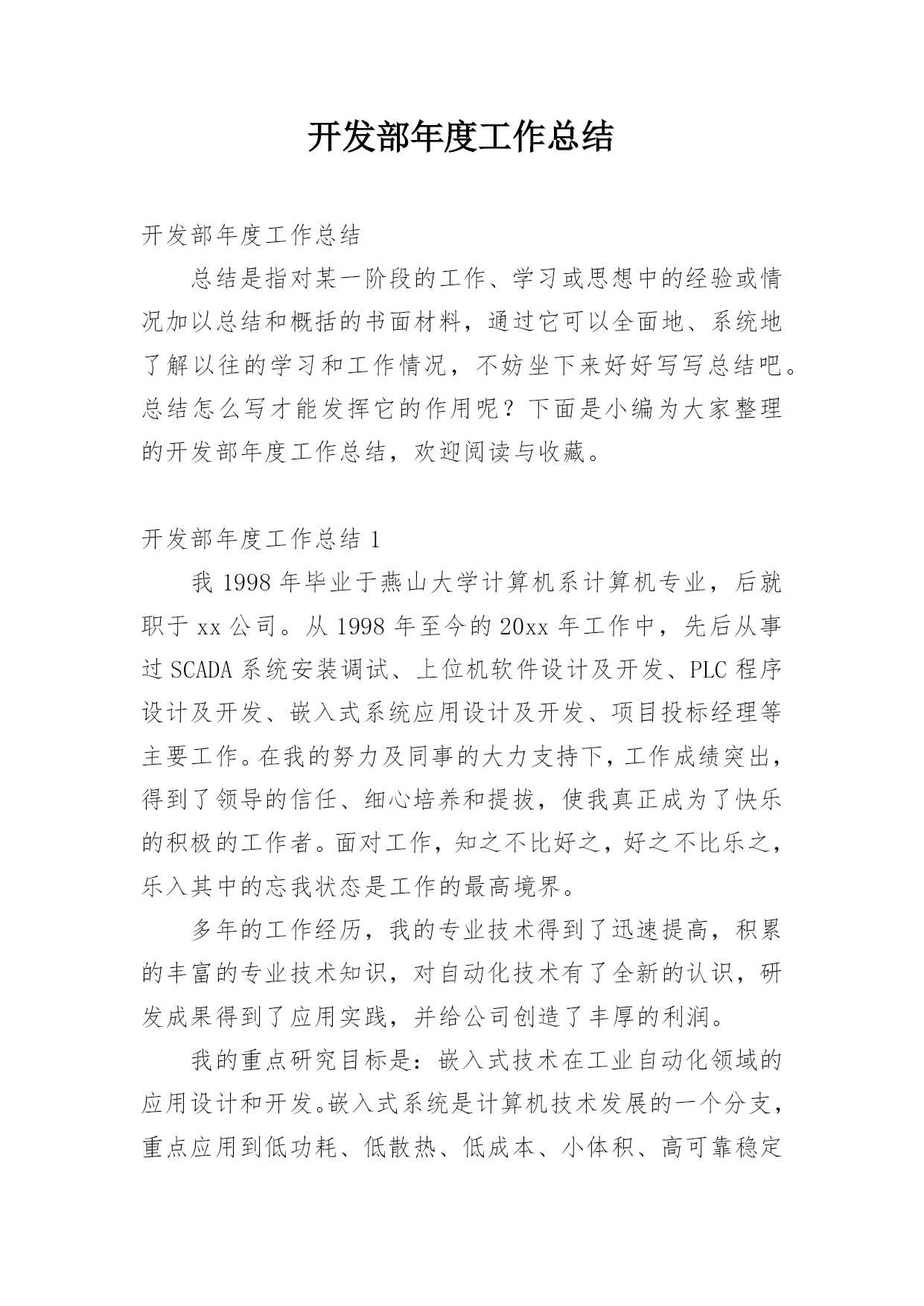 开发部年度工作总结总结是在某一时期、某一项目或某些工作告一段落或者全部完成后进行回顾检查、分析评价,从而得出教训和一些规律性认识的一种书面材料,它能使我们及时找出错误并改正,不如立即行动起来写一份总结吧。那么总结有什么格式呢?下面是小编收集整理的开发部年度工作总结,欢迎阅读与收藏。开发部年度工作总结1时光荏苒,20xx离我们而去了。(我们活过了20xx,经历过玛雅传说的世纪末日迎来了“新纪元”。)回首过去一年当中的工作,有酸有甜、有泪有喜、有对有错在20xx年度工作上虽然算不上有什么丰功伟绩,但经手的每一
