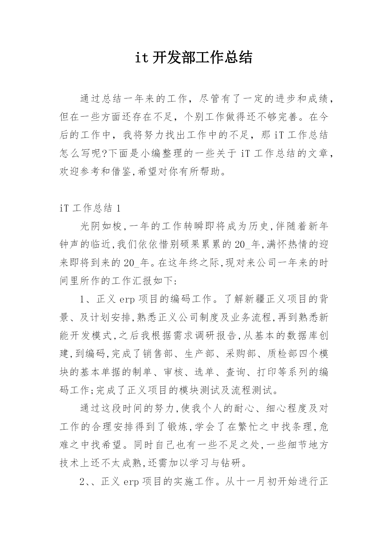 it开发部工作总结通过总结一年来的工作,尽管有了一定的进步和成绩,但在一些方面还存在不足,个别工作做得还不够完善。在今后的工作中,我将努力找出工作中的不足,那iT工作总结怎么写呢?下面是小编整理的一些关于iT工作总结的文章,欢迎参考和借鉴,希望对你有所帮助。iT工作总结1光阴如梭,一年的工作转瞬即将成为历史,伴随着新年钟声的临近,我们依依惜别硕果累累的20_年,满怀热情的迎来即将到来的20_年。在这年终之际,现对来公司一年来的时间里所作的工作汇报如下:1、正义erp项目的编码工作。了解新疆正义项目的背景、