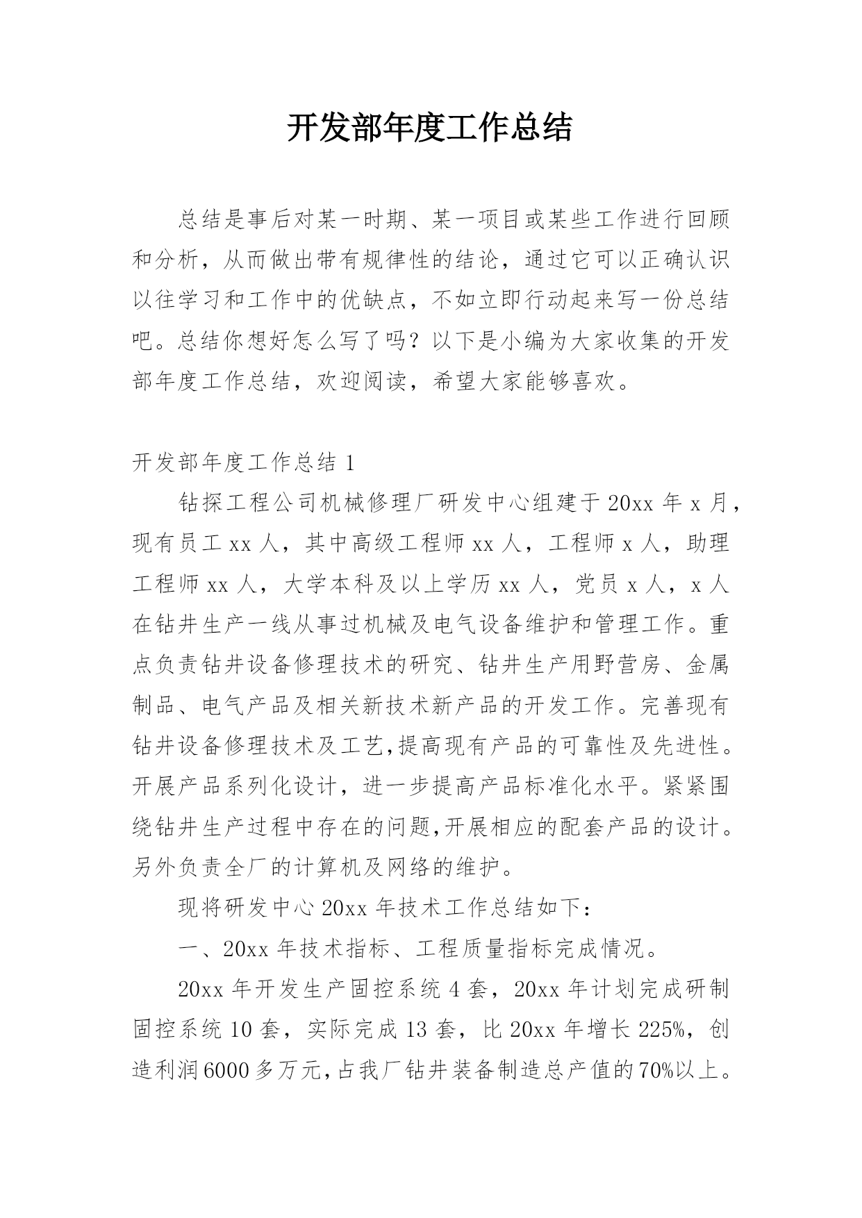 开发部年度工作总结总结是事后对某一时期、某一项目或某些工作进行回顾和分析,从而做出带有规律性的结论,通过它可以正确认识以往学习和工作中的优缺点,不如立即行动起来写一份总结吧。总结你想好怎么写了吗?以下是小编为大家收集的开发部年度工作总结,欢迎阅读,希望大家能够喜欢。开发部年度工作总结1钻探工程公司机械修理厂研发中心组建于20xx年x月,现有员工xx人,其中高级工程师xx人,工程师x人,助理工程师xx人,大学本科及以上学历xx人,党员x人,x人在钻井生产一线从事过机械及电气设备维护和管理工作。重点负责钻井设