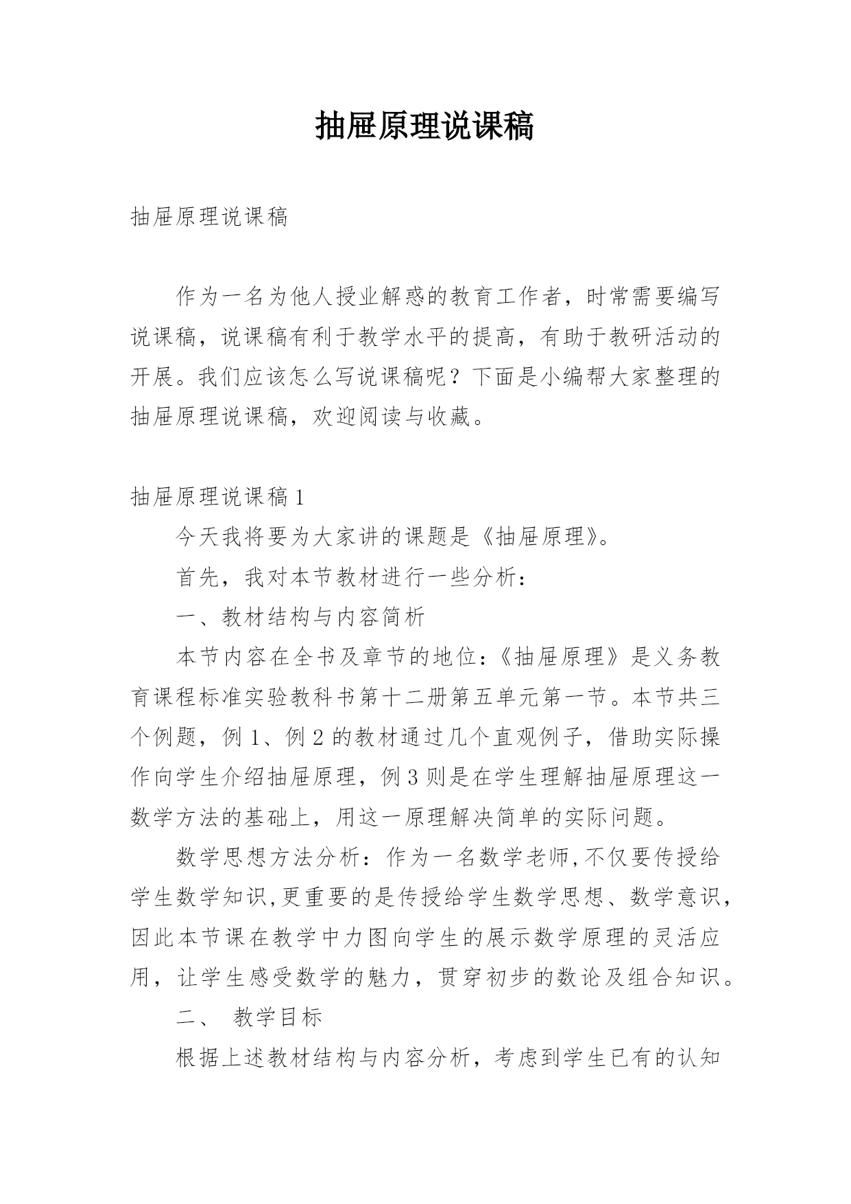 《抽屉原理》说课稿《抽屉原理》说课稿作为一无名无私奉献的教育工作者,总归要编写说课稿,说课稿有利于教学水平的提高,有助于教研活动的开展。怎么样才能写出优秀的说课稿呢?以下是小编整理的《抽屉原理》说课稿,仅供参考,希望能够帮助到大家。《抽屉原理》说课稿1一.说教学内容。我说课的内容是人教版六年级数学下册数学广角《抽屉原理》第一课时,教材70-71页的例1和例2.二.说教学目标。根据《数学课程标准》和教材内容,我确定本节课学习目标如下:知识与技能:经历“抽屉原理”的探究过程,初步了解“抽屉原理”,会用“抽屉原