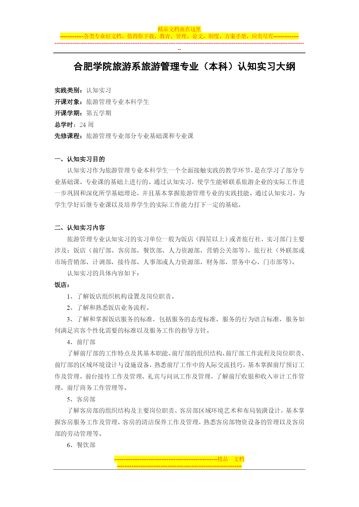 《认知实习》实验与实训指导书课程名称:《认知实习》课程编号:适用专业:建筑工程管理学时数:26学时(1周)执笔人:刘芳审定人:汪惠民湖南高尔夫旅游职业学院学院建筑工程管理专业制定一、实训总目的认识实习是对入学的新生安排的一周的时间,进行建筑市场,提高学生对建筑结构和构造、建筑施工现场、建筑材料的感性认识,为后续课程的学习打下良好的基础。1.实训目标《认识实习》建筑工程管理专业的一个重要的实践性教学环节。学生通过参观建筑材料市场来认识和了解建筑材料的品种、性质、规格、用途等;参