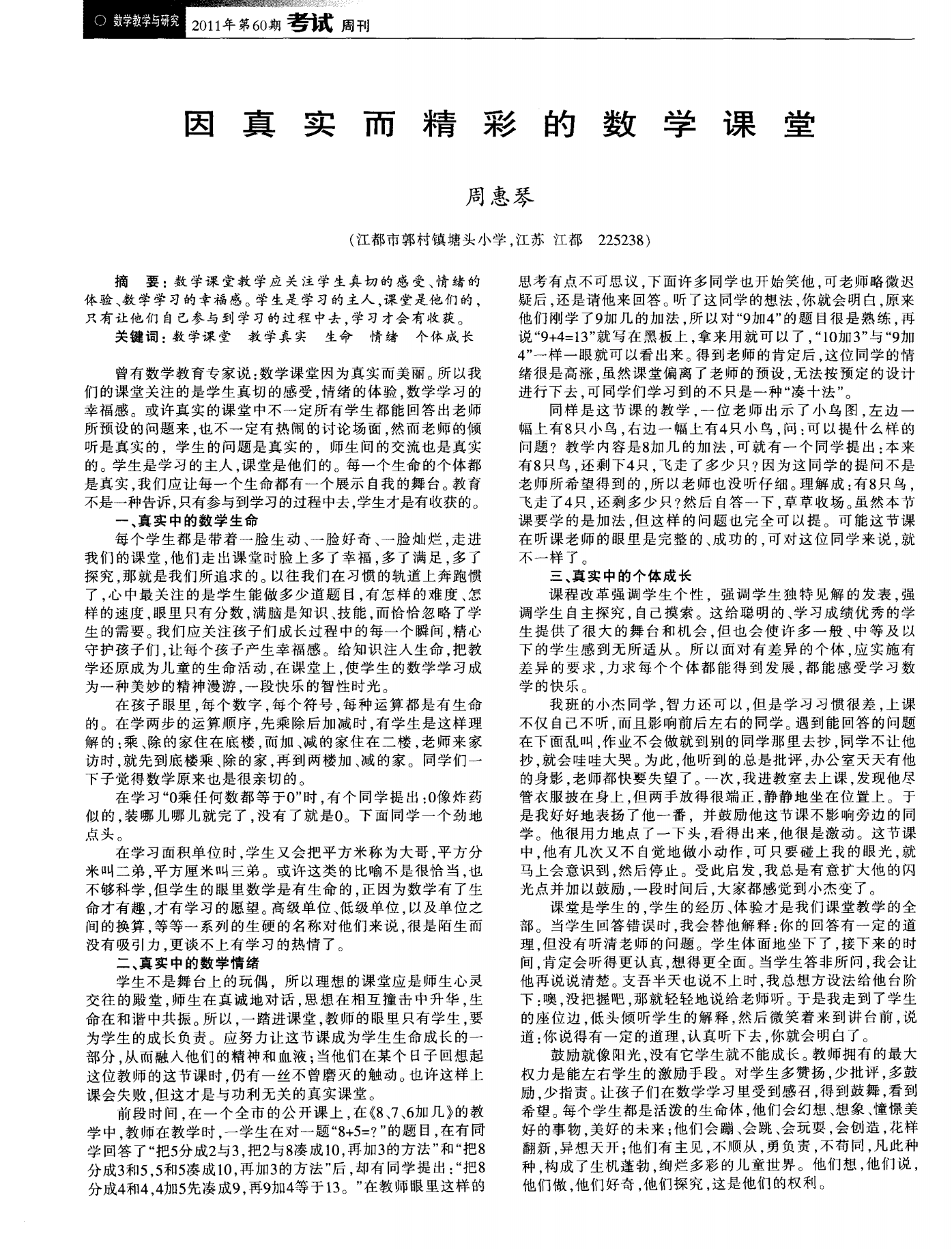 数学课堂因真实而精彩_---------------------------------------上午第一节课,有幸听了李仁冬老师的教研公开课—分数的大小比较。其中几个真实的精彩片断让我念念不忘,令我迫不及待地要将几个精彩环节与大家一同赏析。一、“试问上回学了啥?”李老师从上课伊始就没有什么精彩华丽的课件、情境引入,而是从平淡的复习当中来个“试问上回学了啥?”给学生复习“把一张纸对折一次再对折一次,其中的1份是这张纸的几分之几?&r