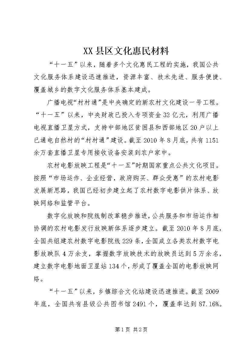 XX县区文化惠民材料“十一五”以来随着多个文化惠民工程的实施我国公共文化服务体系建设迅速推进资源丰富、技术先进、服务便捷、覆盖城乡的数字文化服务体系基本建成。广播电视“村村通”是中央确定的新农村文化建设一号工程。“十一五”以来中央财政已投入专项资金32亿元利用广播电视直播卫星方式支持中部地区贫困县和西部地区20户以上已通电自然村的“村村通”建设。截至2010年8月底共有1151余万套直播卫星专用接收设备安装到农户家中。农村电影放映工程是“十一五”时期国家重点公共文