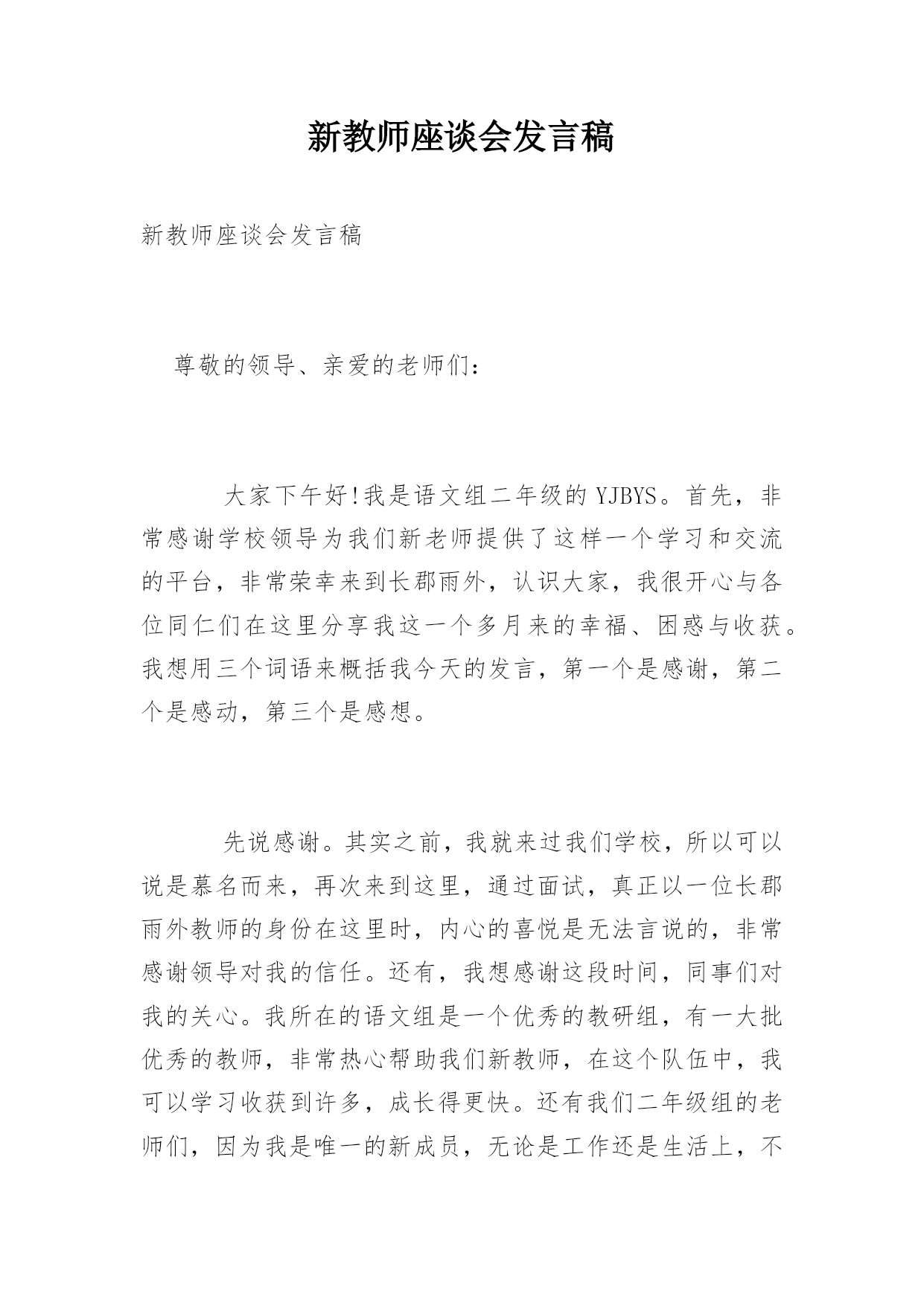 新教师座谈会发言稿新教师座谈会发言稿尊敬的领导、亲爱的老师们:大家下午好!我是语文组二年级的YJBYS。首先,非常感谢学校领导为我们新老师提供了这样一个学习和交流的平台,非常荣幸来到长郡雨外,认识大家,我很开心与各位同仁们在这里分享我这一个多月来的幸福、困惑与收获。我想用三个词语来概括我今天的发言,第一个是感谢,第二个是感动,第三个是感想。先说感谢。其实之前,我就来过我们学校,所以可以说是慕名而来,再次来到这里,通过面试,真正以一位长郡雨外教师的身份在这里时,内心的喜悦是无法言说的,非常感谢领导对我的信任