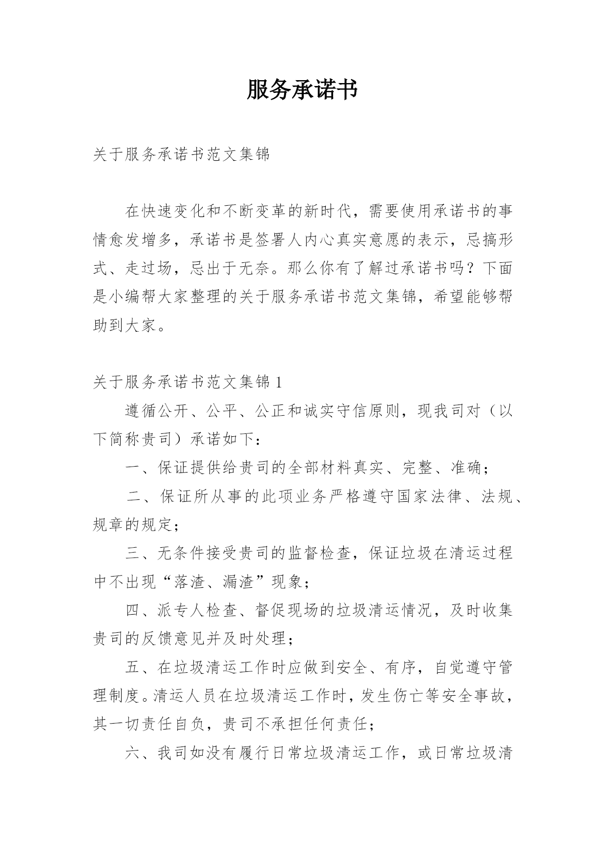服务承诺书关于服务承诺书范文集锦在快速变化和不断变革的新时代,需要使用承诺书的事情愈发增多,承诺书是签署人内心真实意愿的表示,忌搞形式、走过场,忌出于无奈。那么你有了解过承诺书吗?下面是小编帮大家整理的关于服务承诺书范文集锦,希望能够帮助到大家。关于服务承诺书范文集锦1遵循公开、公平、公正和诚实守信原则,现我司对(以下简称贵司)承诺如下:一、保证提供给贵司的全部材料真实、完整、准确;二、保证所从事的此项业务严格遵守国家法律、法规、规章的规定;三、无条件接受贵司的监督检查,保证垃圾在清运过程中不出现“落渣、