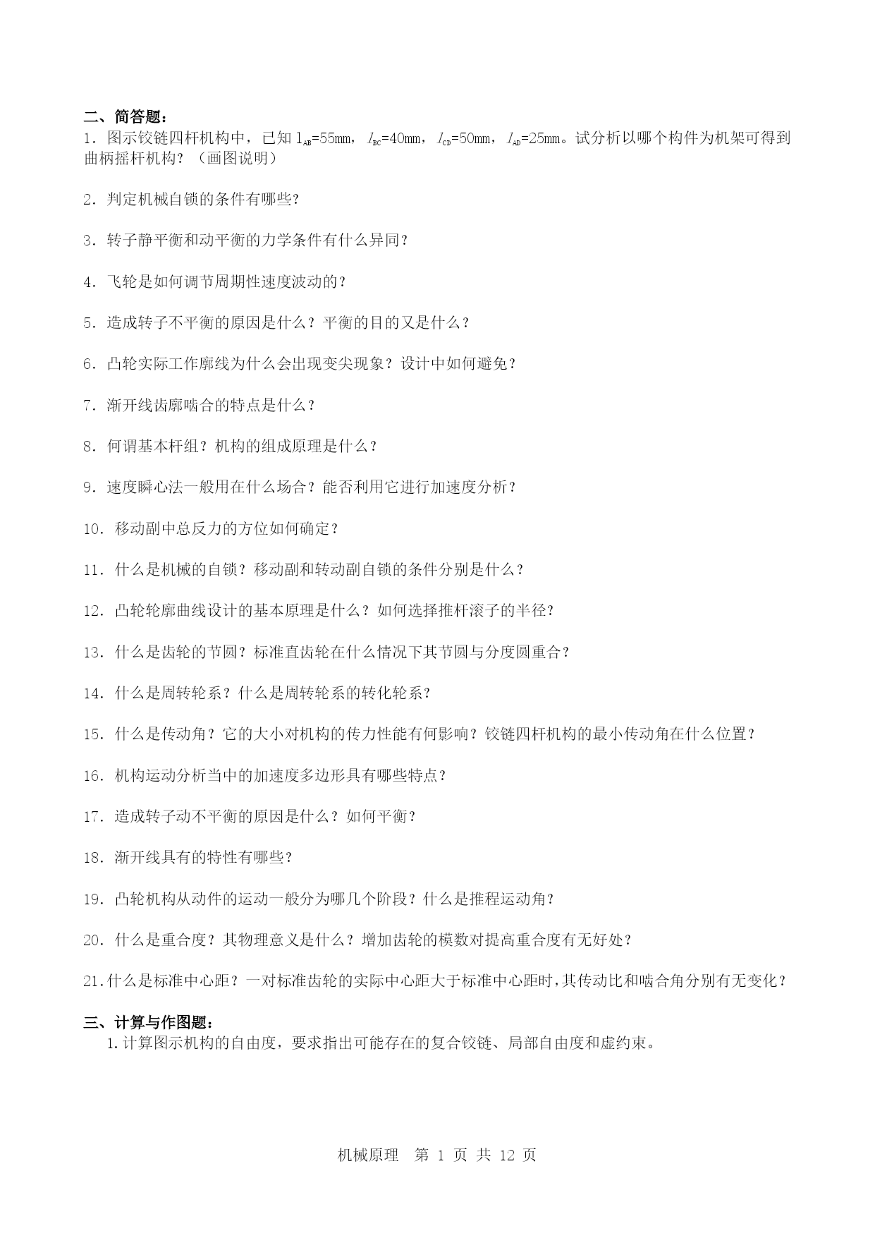 机械原理第页共NUMPAGES12页二、简答题:1.图示铰链四杆机构中,已知lAB=55mm,lBC=40mm,lCD=50mm,lAD=25mm。试分析以哪个构件为机架可得到曲柄摇杆机构?(画图说明)2.判定机械自锁的条件有哪些?3.转子静平衡和动平衡的力学条件有什么异同?4.飞轮是如何调节周期性速度波动的?5.造成转子不平衡的原因是什么?平衡的目的又是什么?6.凸轮实际工作廓线为什么会出现变尖现象?设计中如何避免?7.渐开线齿廓啮合的特点是什么?8.何谓基本杆组?