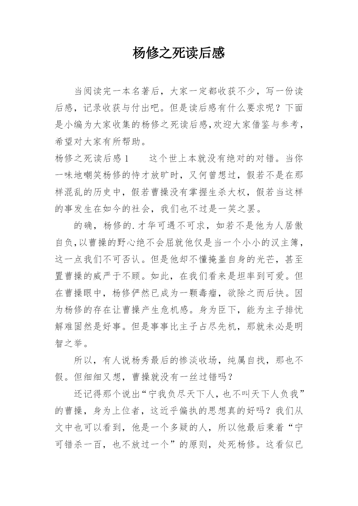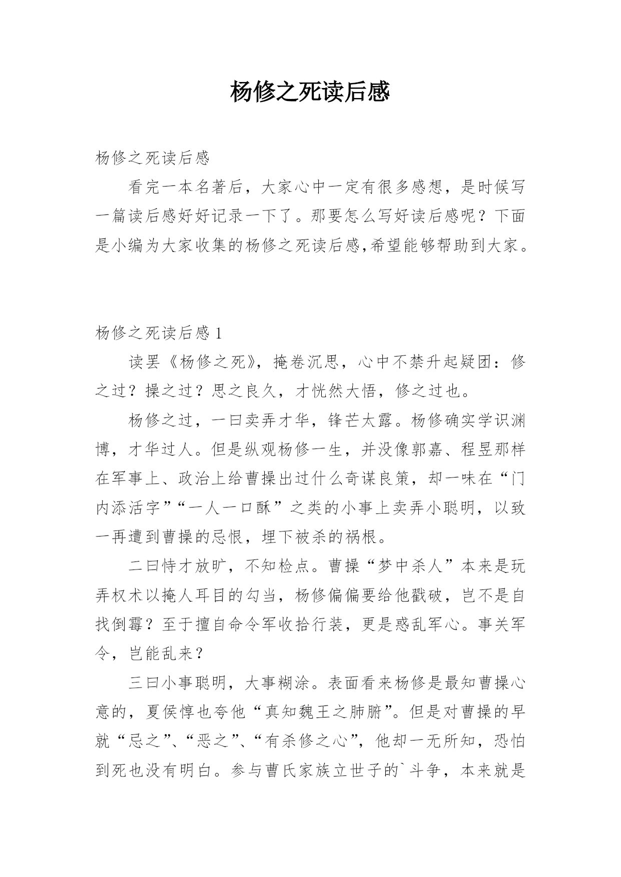 杨修之死读后感杨修之死读后感14篇当品味完一本著作后,大家一定对生活有了新的感悟和看法,记录下来很重要哦,一起来写一篇读后感吧。现在你是否对读后感一筹莫展呢?下面是小编收集整理的杨修之死读后感,供大家参考借鉴,希望可以帮助到有需要的朋友。杨修之死读后感篇1杨修,好一个奇才!杨修该不该死,不去辩论。他的'才能,绝对在常人之上——能轻易掀开曹操心思的外纱,可谓奇才。可是,他的智慧甚至不比常人——恃才放旷的杨修,带着些傲气,不知道尊重别人,他得罪曹操不知几次,让曹操恨再爱上;应该说,他不识时务。从人情看,对他我
