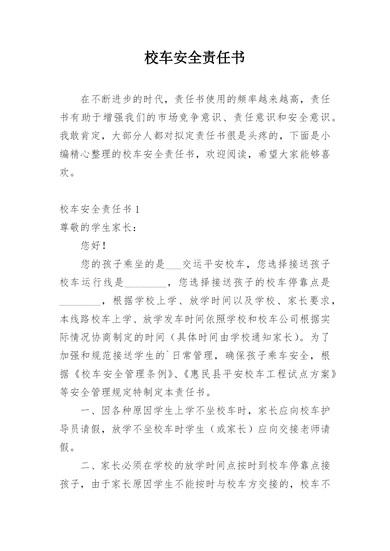校车安全责任书在不断进步的时代,责任书使用的频率越来越高,责任书有助于增强我们的市场竞争意识、责任意识和安全意识。我敢肯定,大部分人都对拟定责任书很是头疼的,下面是小编精心整理的校车安全责任书,欢迎阅读,希望大家能够喜欢。校车安全责任书1尊敬的学生家长:您好!您的孩子乘坐的是___交运平安校车,您选择接送孩子校车运行线是________,您选择接送孩子的校车停靠点是________,根据学校上学、放学时间以及学校、家长要求,本线路校车上学、放学发车时间依照学校和校车公司根据实际情况协商制定的时间(具体时间
