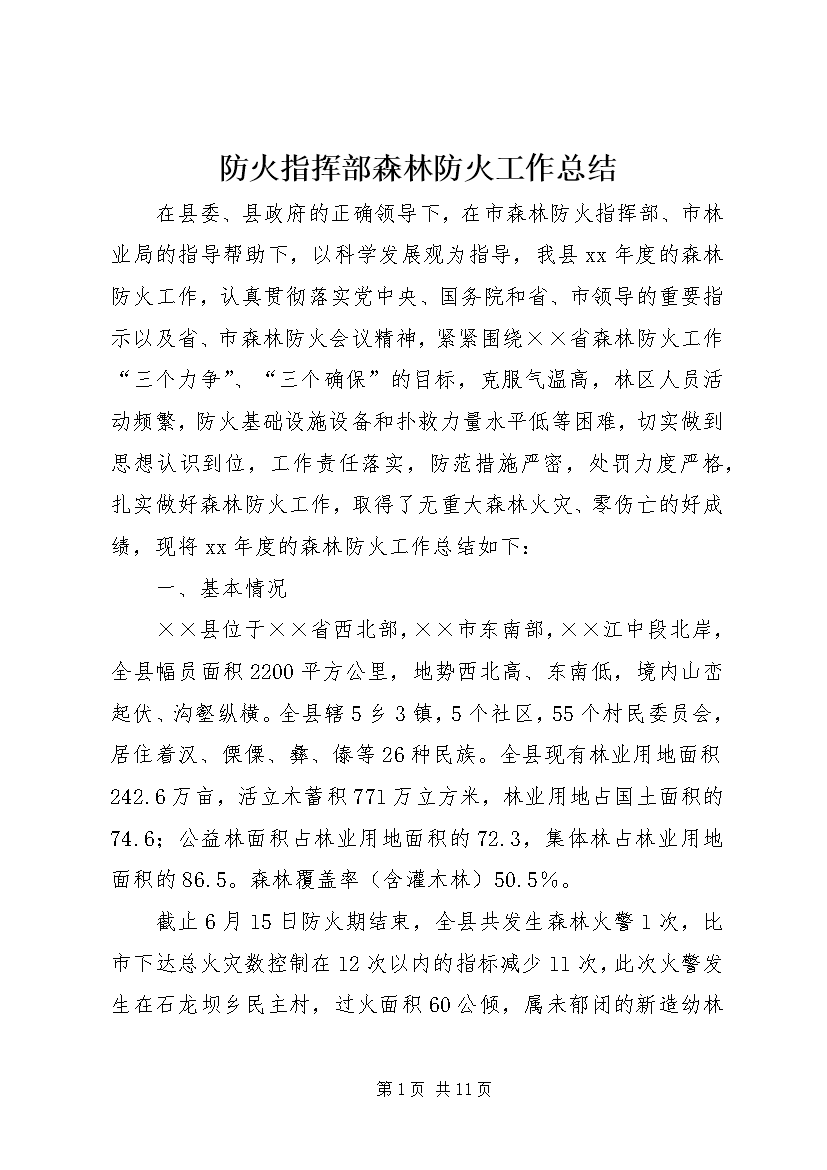 第PAGE\*Arabic\*MERGEFORMAT11页共NUMPAGES\*MERGEFORMAT11页防火指挥部森林防火工作总结在县委、县政府的正确领导下,在市森林防火指挥部、市林业局的指导帮助下,以科学发展观为指导,我县xx年度的森林防火工作,认真贯彻落实党中央、国务院和省、市领导的重要指示以及省、市森林防火会议精神,紧紧围绕××省森林防火工作“三个力争”、“三个确保”的目标,克服气温高,林区人员活动频繁,防火基础设施设备和扑救力量水平低等困难,切实做到思想认识到位,工作责任落实,防范