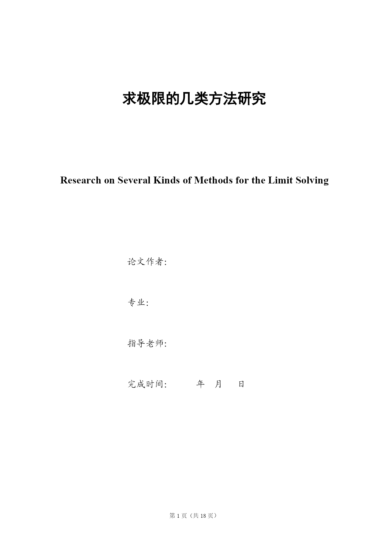 ()求极限的几类方法研究ResearchonSeveralKindsofMethodsfortheLimitSolving论文作者:专业:指导老师:完成时间:年月日摘要求极限的方法是高等数学的基础,也在解决生活中的问题上发挥越来越重要的作用.文章结合极限的基本思想,归纳与总结求极限的几种重要方法:两个重要极限,洛必达法则,泰勒公式等,并结合具体例子进行介绍.Themethodsoflimitsolvingarethebasisofadvancedmathematics,andalsoplayingamor