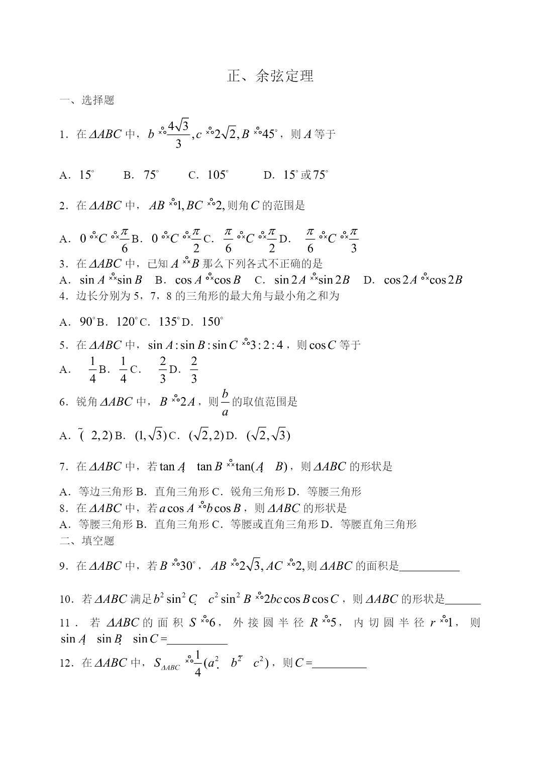 正、余弦定理一、选择题1.在中,,则等于A.B.C.D.或2.在中,则角的范围是A.B.C.D.3.在中,已知那么下列各式不正确的是A.B.C.D.4.边长分别为5,7,8的三角形的最大角与最小角之和为A.B.C.D.5.在中,,则等于A.B.C.D.6.锐角中,,则的取值范围是A.B.C.D.7.在中,若,则的形状是A.等边三角形B.直角三角形C.锐角三角形D.等腰三角形8.在中,若,则的形状是A.等腰三角形B.直角三角形C.等腰或直角三角形D.等腰直角三角形二、填空题9.在中,若,则的面积是10.若满