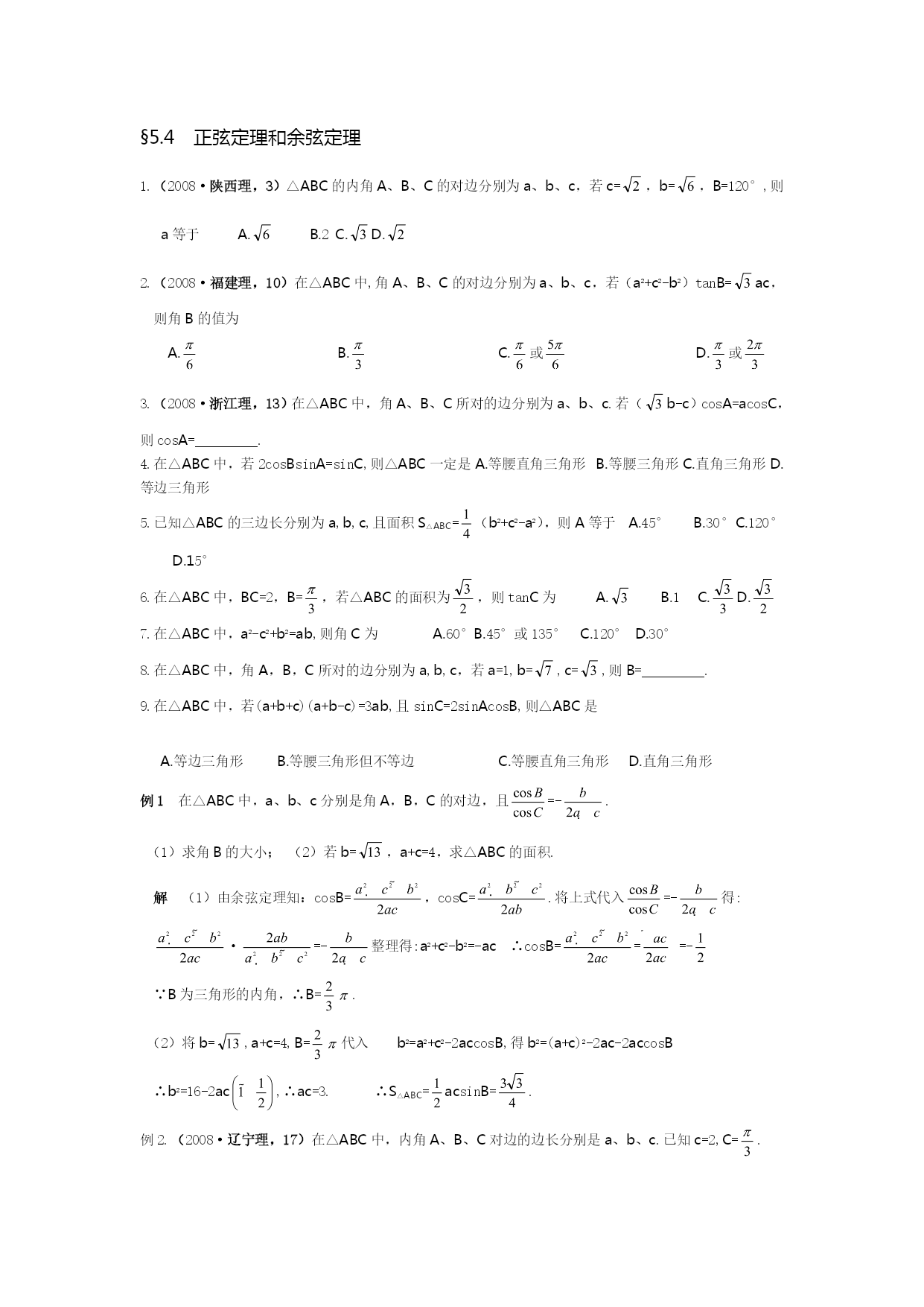 §5.4正弦定理和余弦定理1.(2008·陕西理,3)△ABC的内角A、B、C的对边分别为a、b、c,若c=,b=,B=120°,则a等于A.B.2C.D.2.(2008·福建理,10)在△ABC中,角A、B、C的对边分别为a、b、c,若(a2+c2-b2)tanB=ac,则角B的值为A.B.C.或D.或3.(2008·浙江理,13)在△ABC中,角A、B、C所对的边分别为a、b、c.若(b-c)cosA=acosC,则cosA=.4.在△ABC中,若2cosBsinA=sinC,则△ABC一定是A.等腰