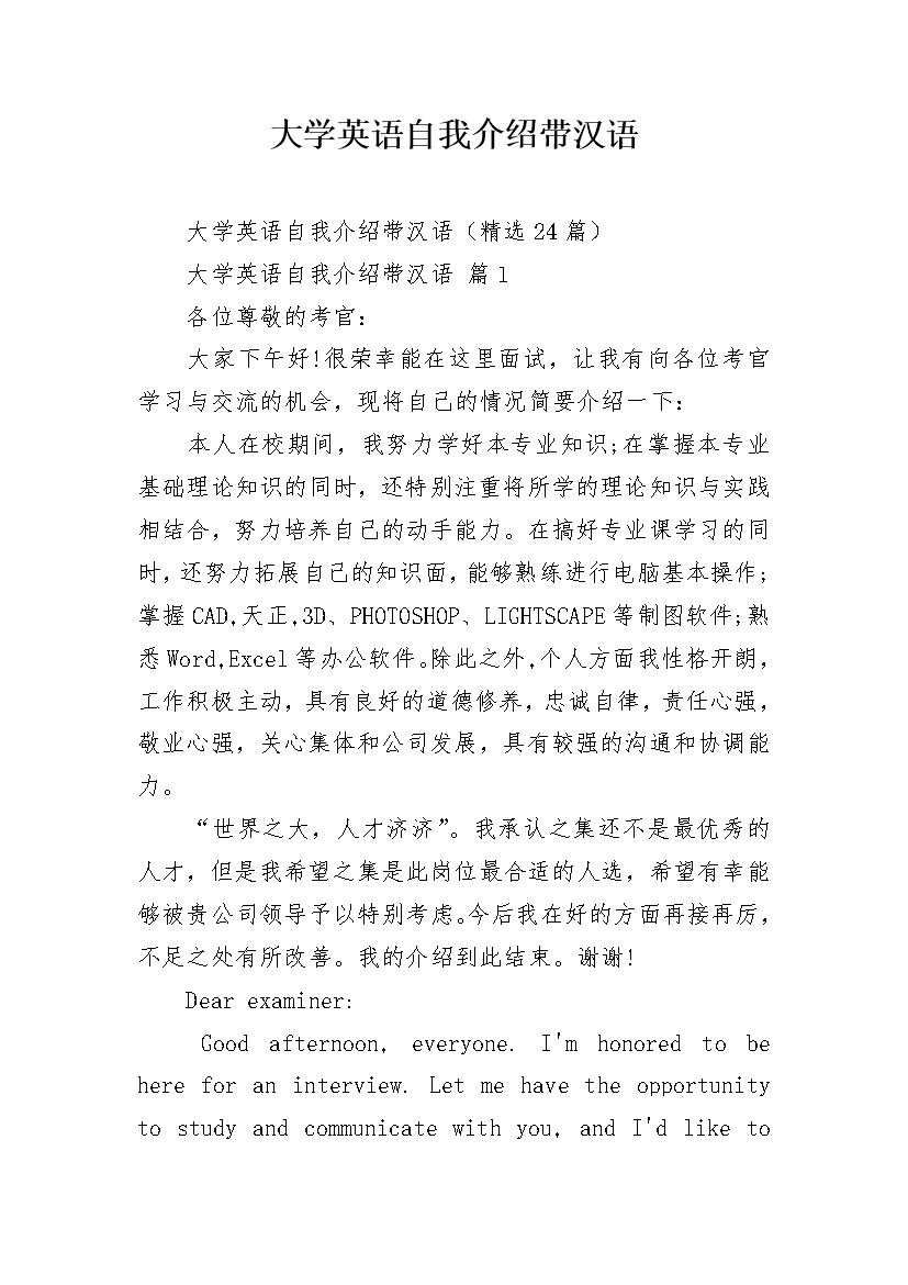 大学英语自我介绍带汉语大学英语自我介绍带汉语(精选24篇)大学英语自我介绍带汉语篇1各位尊敬的考官:大家下午好!很荣幸能在这里面试,让我有向各位考官学习与交流的机会,现将自己的情况简要介绍一下:本人在校期间,我努力学好本专业知识;在掌握本专业基础理论知识的同时,还特别注重将所学的理论知识与实践相结合,努力培养自己的动手能力。在搞好专业课学习的同时,还努力拓展自己的知识面,能够熟练进行电脑基本操作;掌握CAD,天正,3D、PHOTOSHOP、LIGHTSCAPE等制图软件;熟悉Word,Excel等办公软件