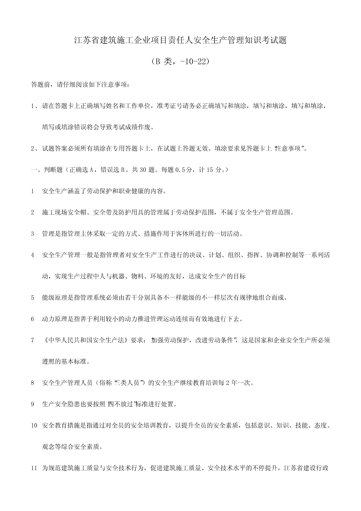江苏省建筑施工企业项目责任人安全生产管理知识考试题(B类,-10-22)答题前,请仔细阅读如下注意事项:1、请在答题卡上正确填写姓名和工作单位,准考证号请务必正确填写和填涂,填写和填涂,填写和填涂,填写或填涂错误将会导致考试成绩作废。2、试题答案必须所有填涂在专用答题卡上,在试题上答题无效。填涂要求见答题卡上“注意事项”。一、判断题(正确选A,错误选B。共30题。每题0.5分,计15分。)1安全生产涵盖了劳动保护和职业健康的内容。2施工现场安全帽、安全带及防护用具的管理属于劳动保护范围,不属于安全生产管理