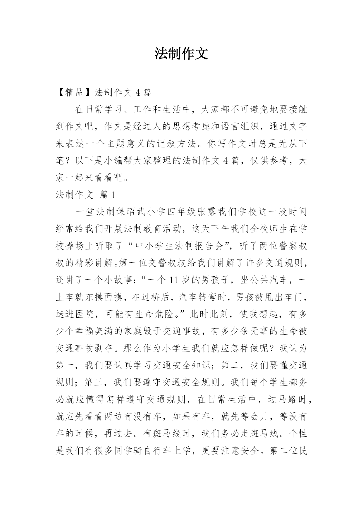 法制作文【精品】法制作文4篇在日常学习、工作和生活中,大家都不可避免地要接触到作文吧,作文是经过人的思想考虑和语言组织,通过文字来表达一个主题意义的记叙方法。你写作文时总是无从下笔?以下是小编帮大家整理的法制作文4篇,仅供参考,大家一起来看看吧。法制作文篇1一堂法制课昭武小学四年级张露我们学校这一段时间经常给我们开展法制教育活动,这天下午我们全校师生在学校操场上听取了“中小学生法制报告会”,听了两位警察叔叔的精彩讲解。第一位交警叔叔给我们讲解了许多交通规则,还讲了一个小故事:“一个11岁的男孩子,坐公共汽