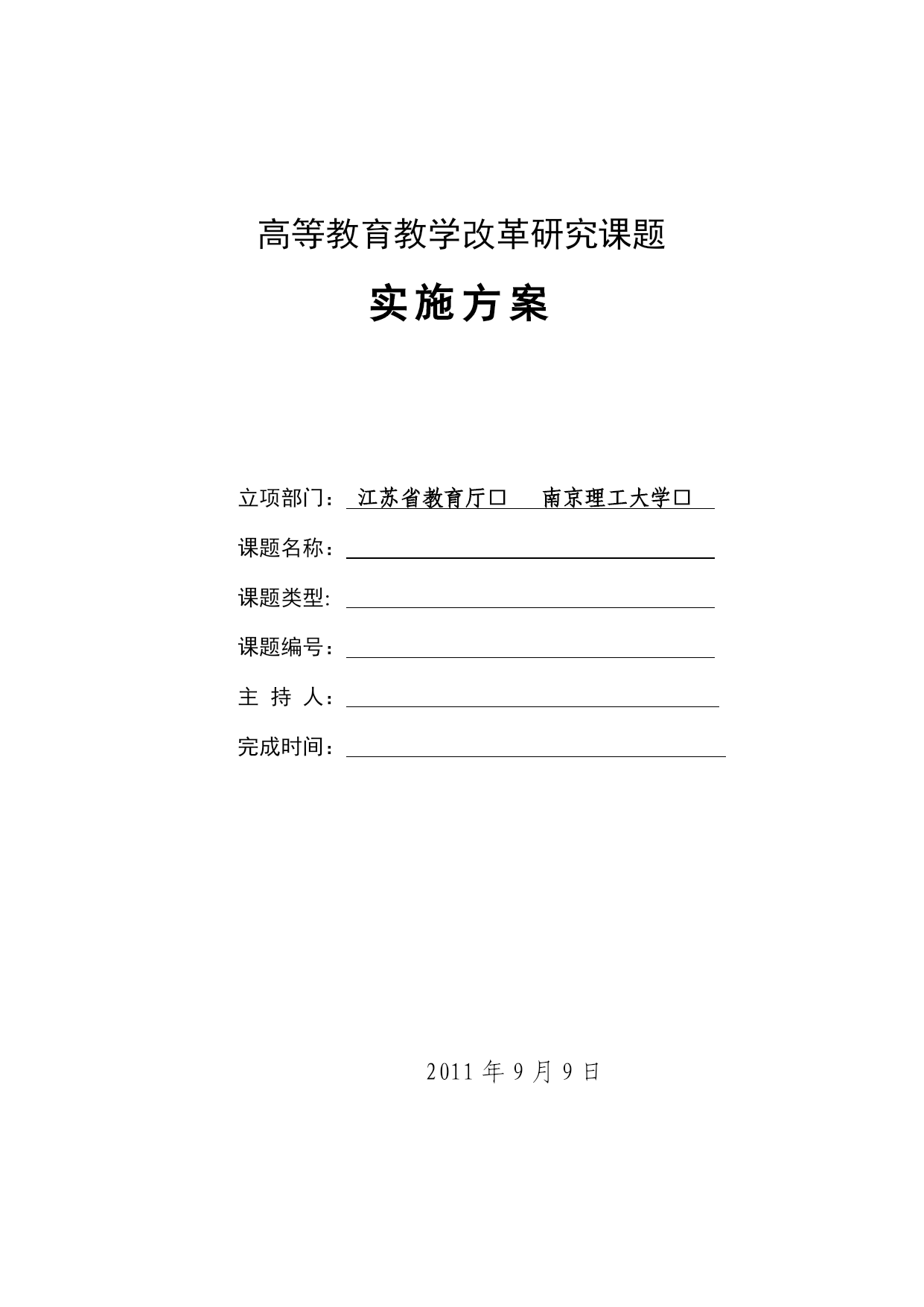 高等教育教学改革研究课题实施方案立项部门:江苏省教育厅□南京理工大学□课题名称:课题类型:课题编号:主持人:完成时间:2011年9月9日填写要求1.立项部门:课题立项的主管部门,同一课题如果既是省级课题又是校级课题,只需在“江苏省教育厅”后的“□”打“√”,并据此填写后续信息。2.课题名称:以申报立项的课题名称为准。3.课题类型:省级课题填写重中之重、重点项目、一般项目或外研社合作项目;校级课题填写重点资助项目、一般资助项目或非资助项目。4.课题编号:省级课题填写省教育厅(苏教高〔2011〕29号)公布的