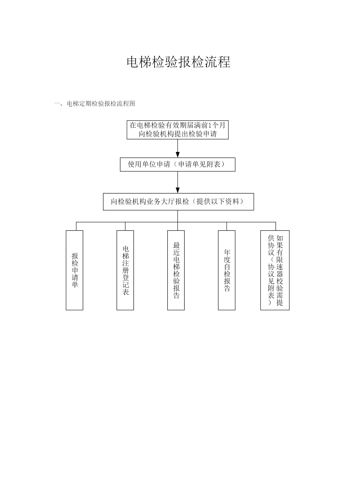 电梯检验报检流程一、电梯定期检验报检流程图二、安装监督检验流程图三、部分问题解答1、到期未检电梯的处理方式(1)对于超过检验期限三个月以内未检的电梯用户,要写出书面申请,经有关检验科室负责人和业务发展部负责人签字后方可受理报检。(2)对于超过检验期限三个月以上未检的电梯用户,先到市局特设处或各分局处理后,凭处理单来我院报检,并经有关检验科室负责人和业务发展部负责人签字后方可受理报检。(3)超过两个月需加收相应检验费。2、检验报告丢失补办方式(1)在报社刊登遗失广告,广告内容中要写明设备注册代码和报告编号。