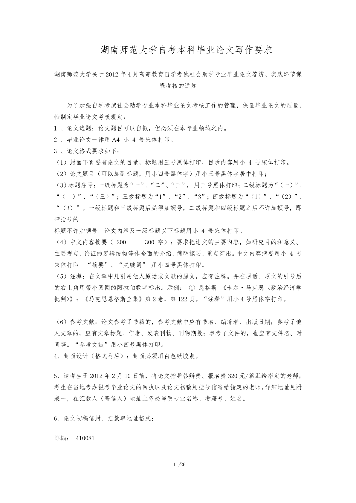 湖南师范大学自考本科毕业论文写作要求湖南师范大学关于2012年4月高等教育自学考试社会助学专业毕业论文答辨、实践环节课程考核的通知为了加强自学考试社会助学专业本科毕业论文考核工作的管理,保证毕业论文的质量,特制定毕业论文考核规定:1、论文选题:论文题目可以自拟,但必须在本专业领域之内。2、毕业论文一律用A4小4号宋体打印。3、论文格式要求如下:(1)封面下页要有论文的目录,标题用三号黑体打印,目录内容用小4号宋体打印。(2)论文题目(可以加副标题,用小四号黑体字)用小三号黑体字居中打印;(3)标题序号:一