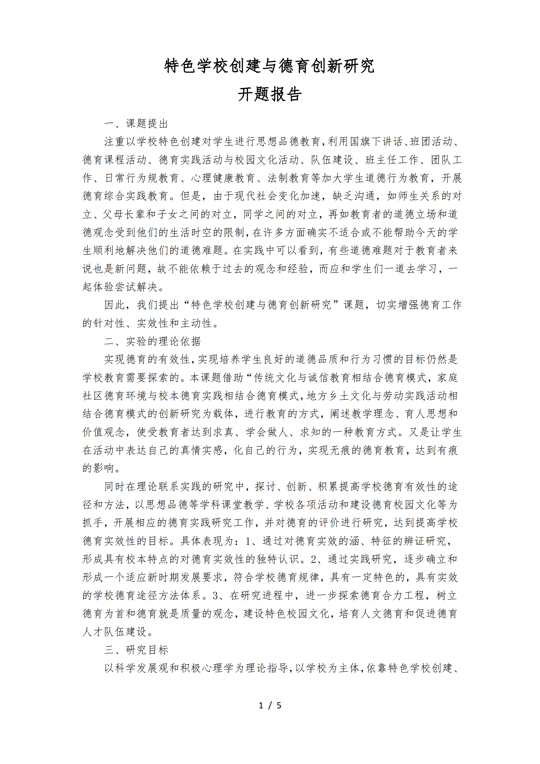 特色学校创建与德育创新研究开题报告一、课题提出注重以学校特色创建对学生进行思想品德教育利用国旗下讲话、班团活动、德育课程活动、德育实践活动与校园文化活动、队伍建设、班主任工作、团队工作、日常行为规教育、心理健康教育、法制教育等加大学生道德行为教育开展德育综合实践教育。但是由于现代社会变化加速缺乏沟通如师生关系的对立、父母长辈和子女之间的对立同学之间的对立再如教育者的道德立场和道德观念受到他们的生活时空的限制在许多方