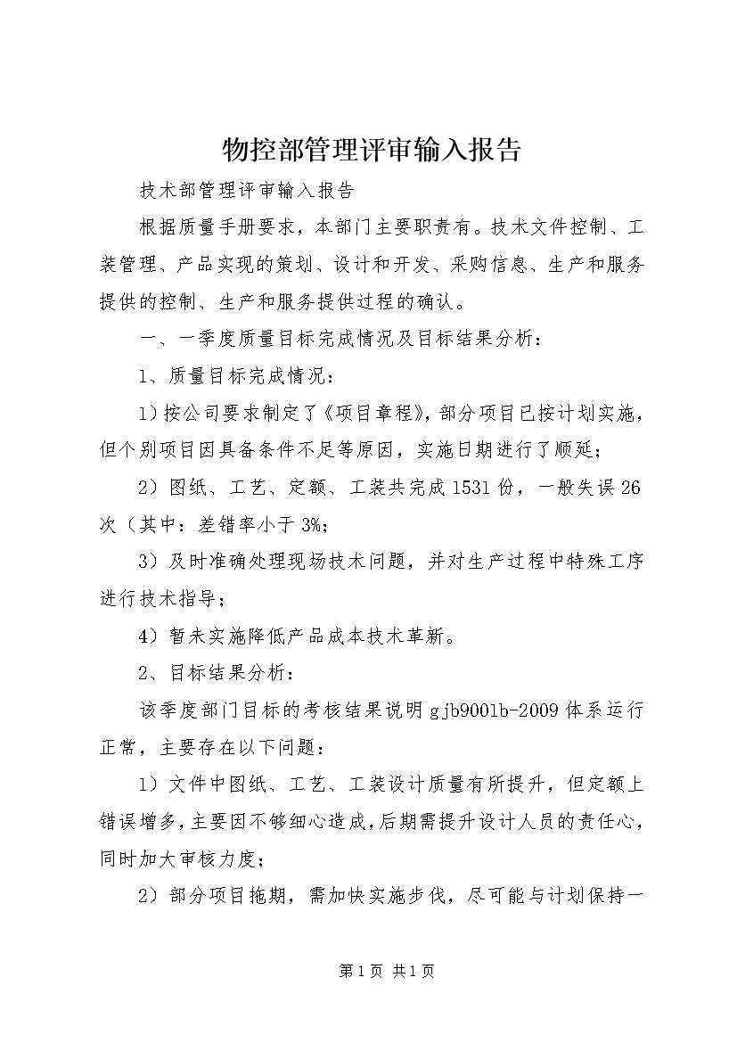 物控部管理评审输入报告技术部管理评审输入报告根据质量手册要求本部门主要职责有。技术文件控制、工装管理、产品实现的策划、设计和开发、采购信息、生产和服务提供的控制、生产和服务提供过程的确认。一、一季度质量目标完成情况及目标结果分析:1、质量目标完成情况:1)按公司要求制定了《项目章程》部分项目已按计划实施但个别项目因具备条件不足等原因实施日期进行了顺延;2)图纸、工艺、定额、工装共完成1531份一般失误26次(其中:差错率小于3%;