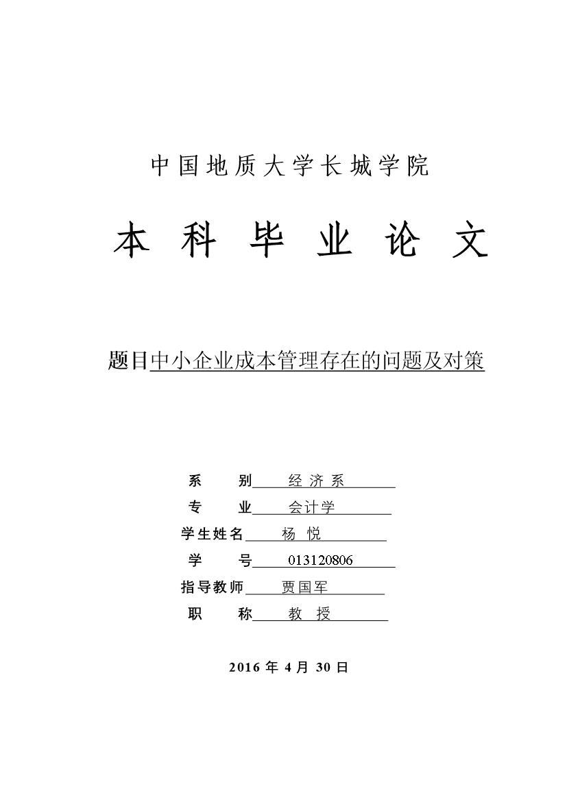 中国地质大学长城学院本科毕业论文题目中小企业成本管理存在的问题及对策系别经济系专业会计学学生姓名杨悦学号013120806指导教师贾国军职称教授2016年4月30日本科毕业生毕业论文(设计)诚信承诺书毕业论文(设计)题目中小企业成本管理存在的问题及对策学生姓名杨悦专业会计学学号013120806指导老师贾国军职称教授所在系别经济系诚信承诺本人慎重承诺和声明:我承诺在毕业论文(设计)活动中遵守学校有关规定,恪守学术规范,在本人的毕业论文中不剽窃、抄袭他人的学术观点、思想和成果,不篡改研究数据,如有违规行为发