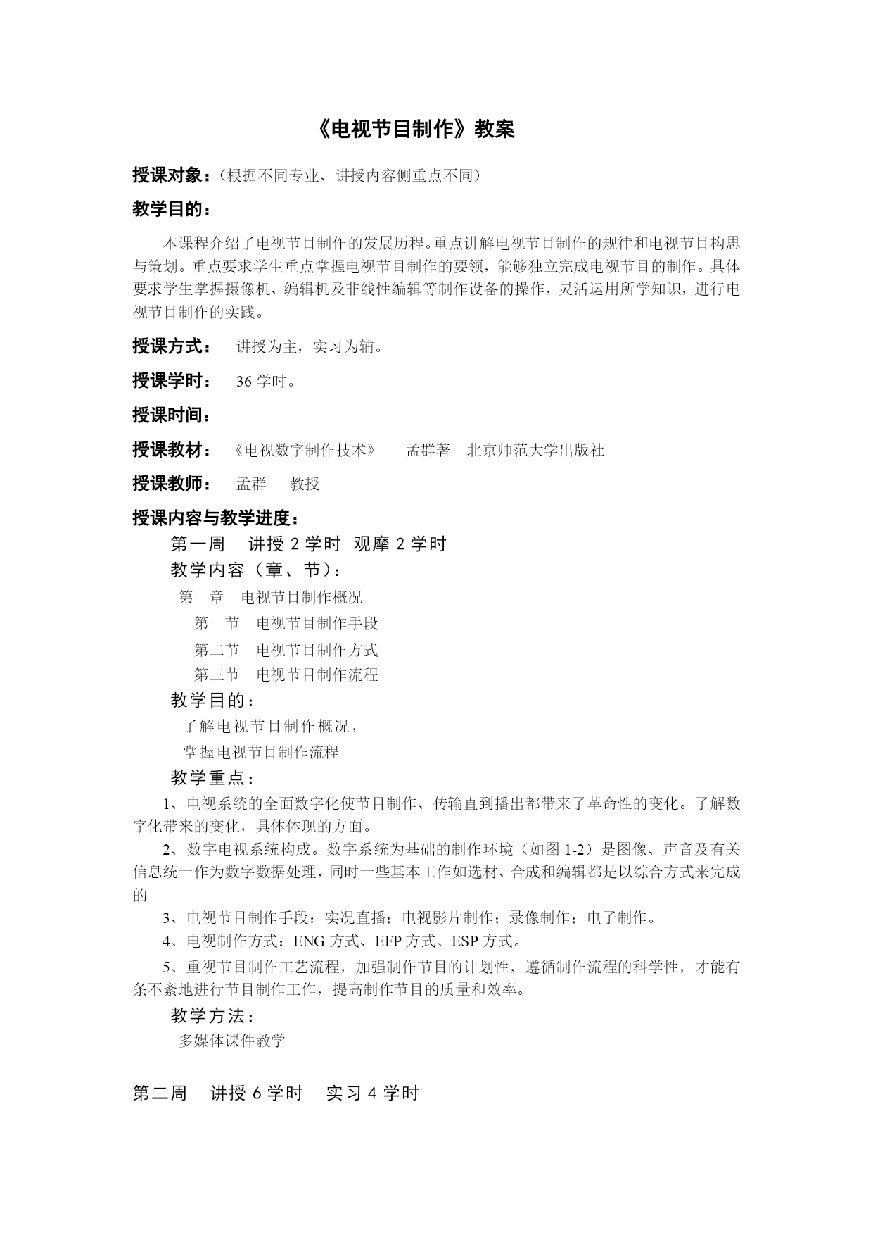 《电视节目制作》教案授课对象:(根据不同专业、讲授内容侧重点不同)教学目的:本课程介绍了电视节目制作的发展历程。重点讲解电视节目制作的规律和电视节目构思与策划。重点要求学生重点掌握电视节目制作的要领,能够独立完成电视节目的制作。具体要求学生掌握摄像机、编辑机及非线性编辑等制作设备的操作,灵活运用所学知识,进行电视节目制作的实践。授课方式:讲授为主,实习为辅。授课学时:36学时。授课时间:授课教材:《电视数字制作技术》孟群著北京师范大学出版社授课教师:孟群教授授课内容与教学进度:第一周讲授2学时观摩2学时教