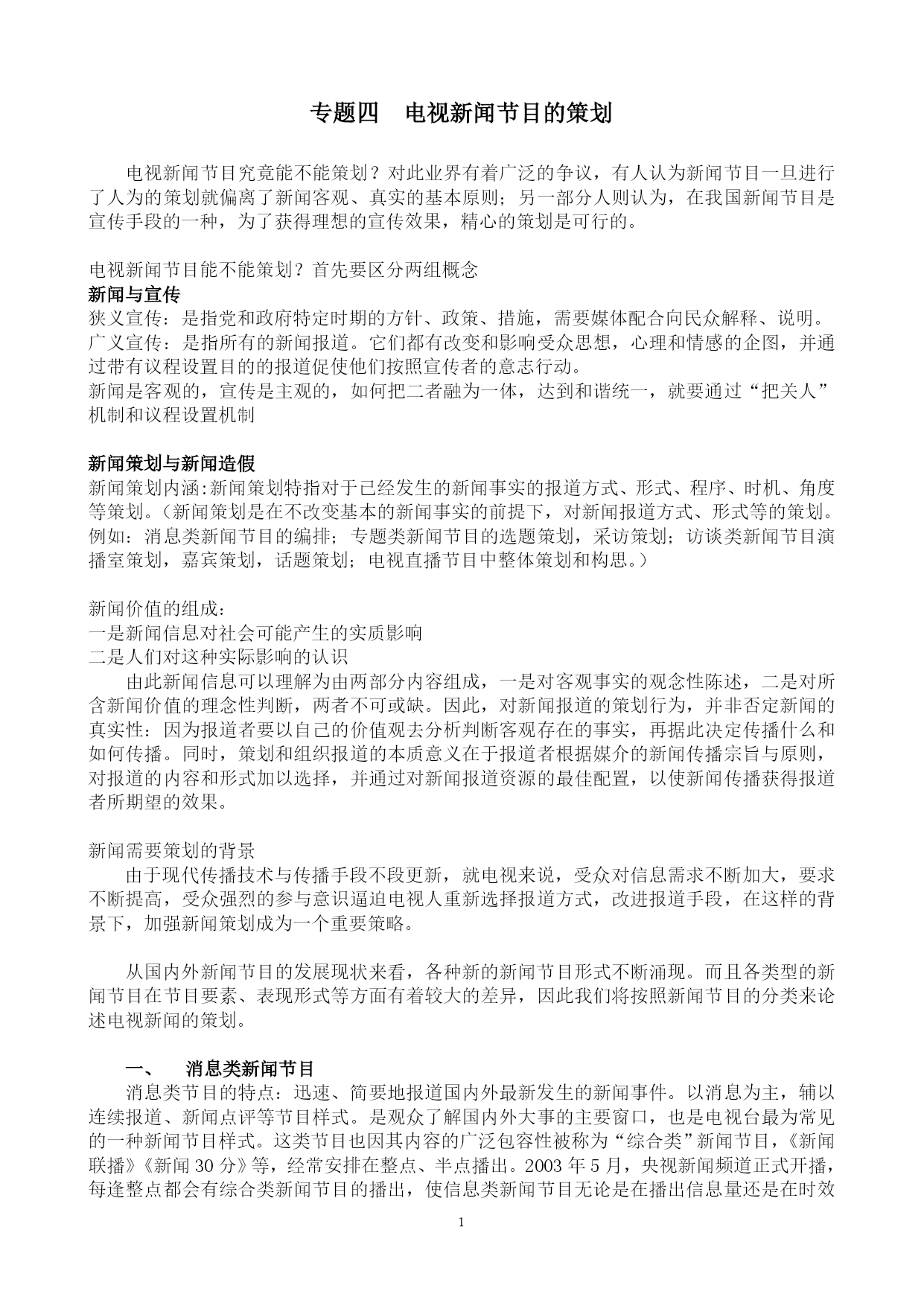 资料内容仅供您学习参考,如有不当或者侵权,请联系改正或者删除。专题四电视新闻节目的策划电视新闻节目究竟能不能策划?对此业界有着广泛的争议,有人认为新闻节目一旦进行了人为的策划就偏离了新闻客观、真实的基本原则;另一部分人则认为,在中国新闻节目是宣传手段的一种,为了获得理想的宣传效果,精心的策划是可行的。电视新闻节目能不能策划?首先要区分两组概念新闻与宣传狭义宣传:是指党和政府特定时期的方针、政策、措施,需要媒体配合向民众解释、说明。广义宣传:是指所有的新闻报道。它们都有改变和影响受众思想,心理和情感的企图,