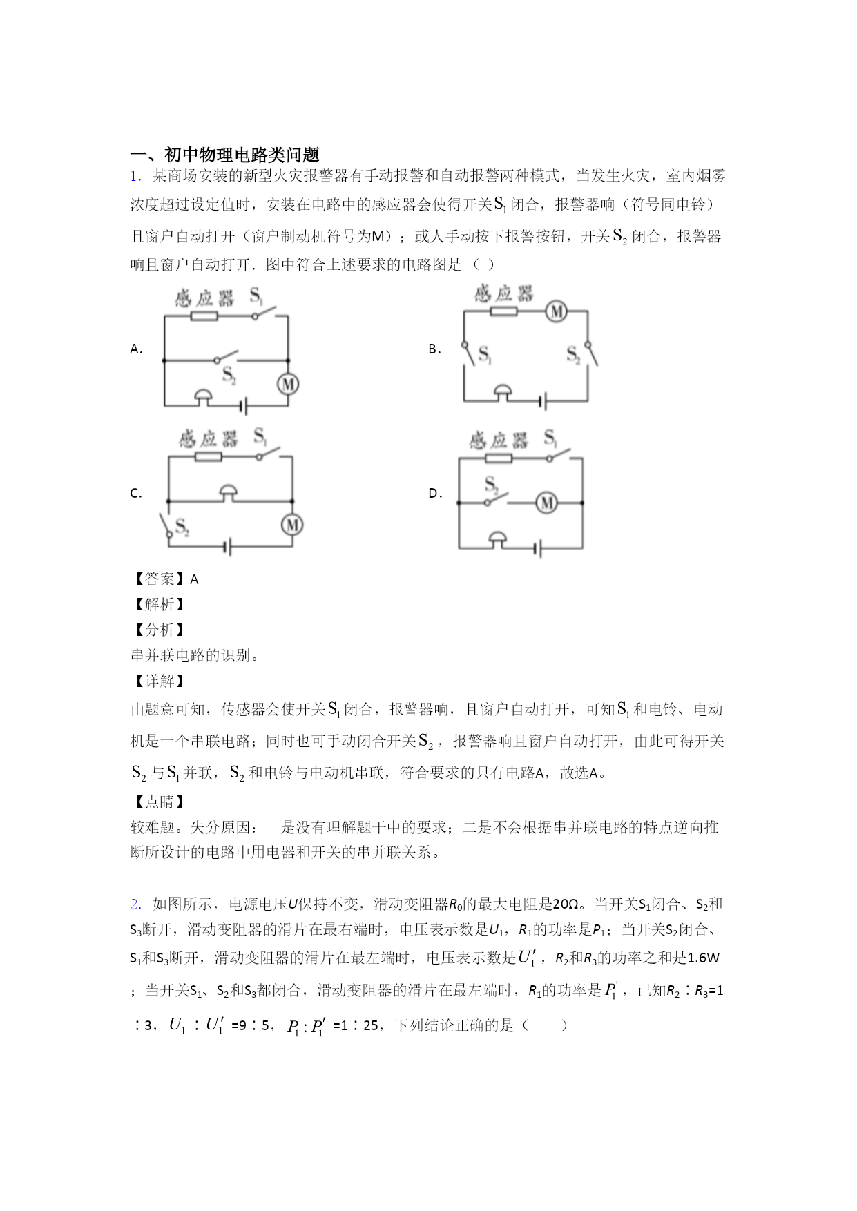 一、初中物理电路类问题1.某商场安装的新型火灾报警器有手动报警和自动报警两种模式,当发生火灾,室内烟雾浓度超过设定值时,安装在电路中的感应器会使得开关闭合,报警器响(符号同电铃)且窗户自动打开(窗户制动机符号为M);或人手动按下报警按钮,开关闭合,报警器响且窗户自动打开.图中符合上述要求的电路图是()A.B.C.D.【答案】A【解析】【分析】串并联电路的识别。【详解】由题意可知,传感器会使开关闭合,报警器响,且窗户自动打开,可知和电铃、电动机是一个串联电路;同时也可手动闭合开关,报警器响且窗户自动打开,由