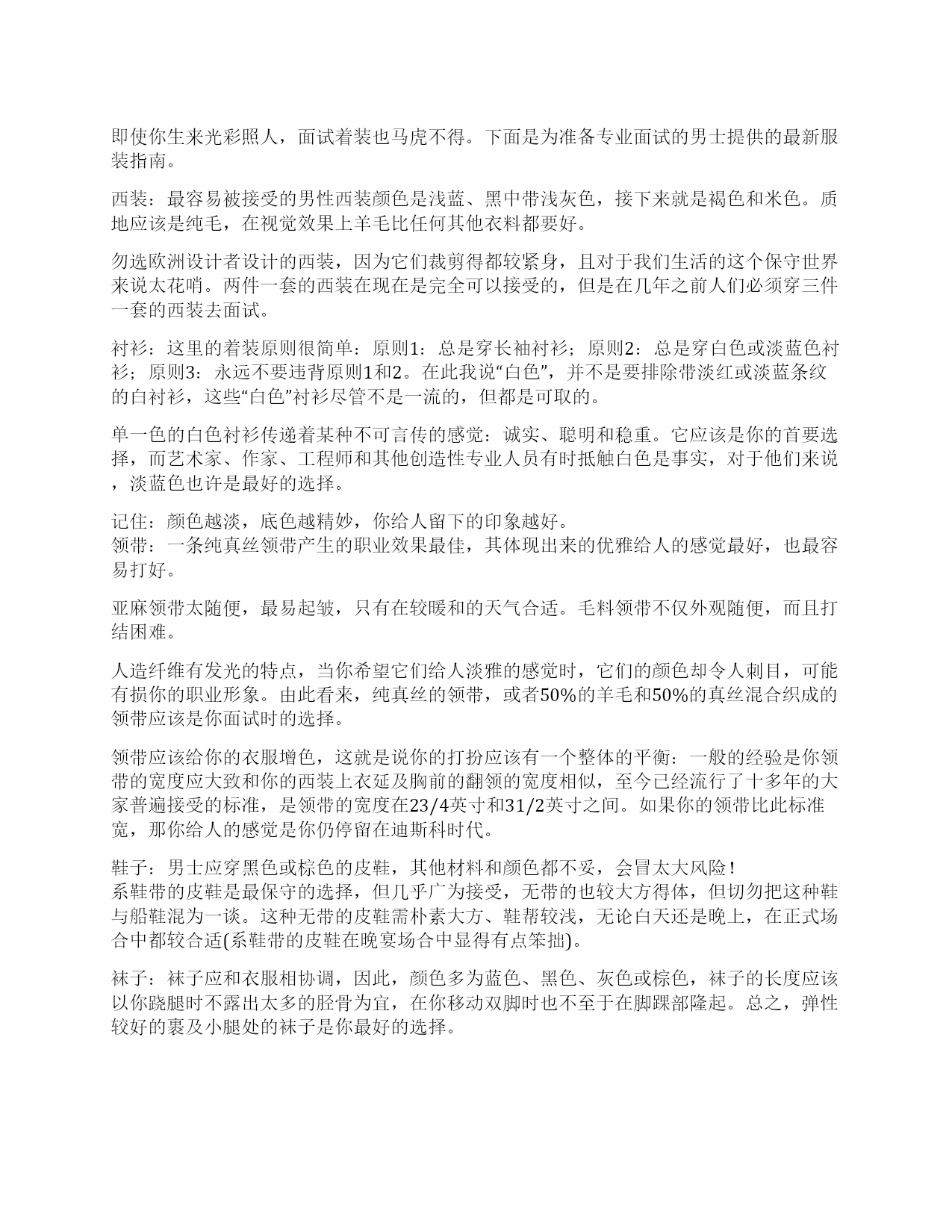 男士成功面试的着装指南男士成功面试的着装指南即使你生来光彩照人,面试着装也马虎不得。下面是为准备专业面试的男士提供的最新服装指南。西装:最容易被接受的男性西装颜色是浅蓝、黑中带浅灰色,接下来就是褐色和米色。质地应该是纯毛,在视觉效果上羊毛比任何其他衣料都要好。勿选欧洲设计者设计的西装,因为它们裁剪得都较紧身,且对于我们生活的这个保守世界来说太花哨。两件一套的西装在现在是完全可以接受的,但是在几年之前人们必须穿三件一套的西装去面试。衬衫:这里的着装原则很简单:原则1:总是穿长袖衬衫;原则2:总是穿白色或淡蓝