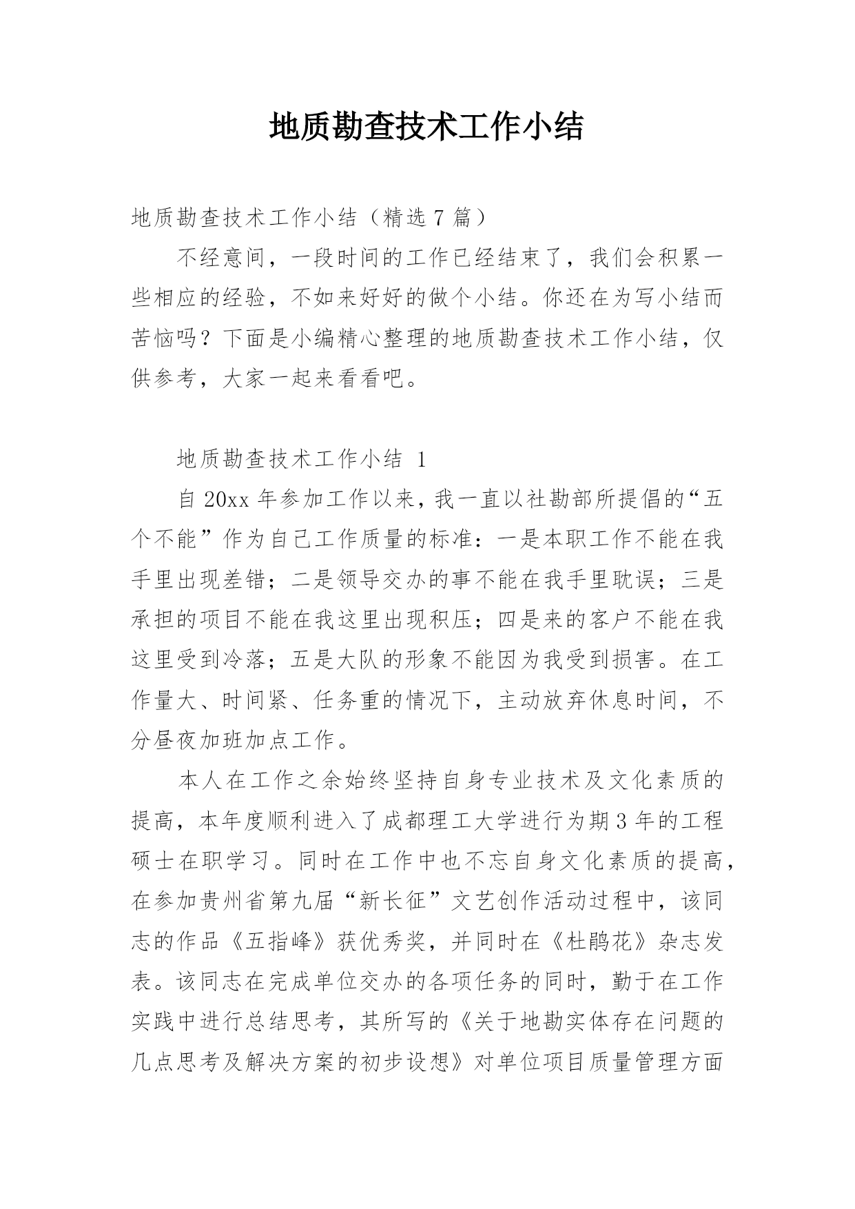 地质勘查技术工作小结地质勘查技术工作小结无情的时光老人像一阵寒风,走得无声又匆匆,我们既增长了见识,也锻炼自身,不如让我们小结经验,展望未来。那么你有了解过小结吗?下面是小编精心整理的地质勘查技术工作小结,欢迎大家分享。自20xx年参加工作以来,我一直以社勘部所提倡的“五个不能”作为自己工作质量的标准:一是本职工作不能在我手里出现差错;二是领导交办的事不能在我手里耽误;三是承担的项目不能在我这里出现积压;四是来的客户不能在我这里受到冷落;五是大队的形象不能因为我受到损害。在工作量大、时间紧、任务重的情况下